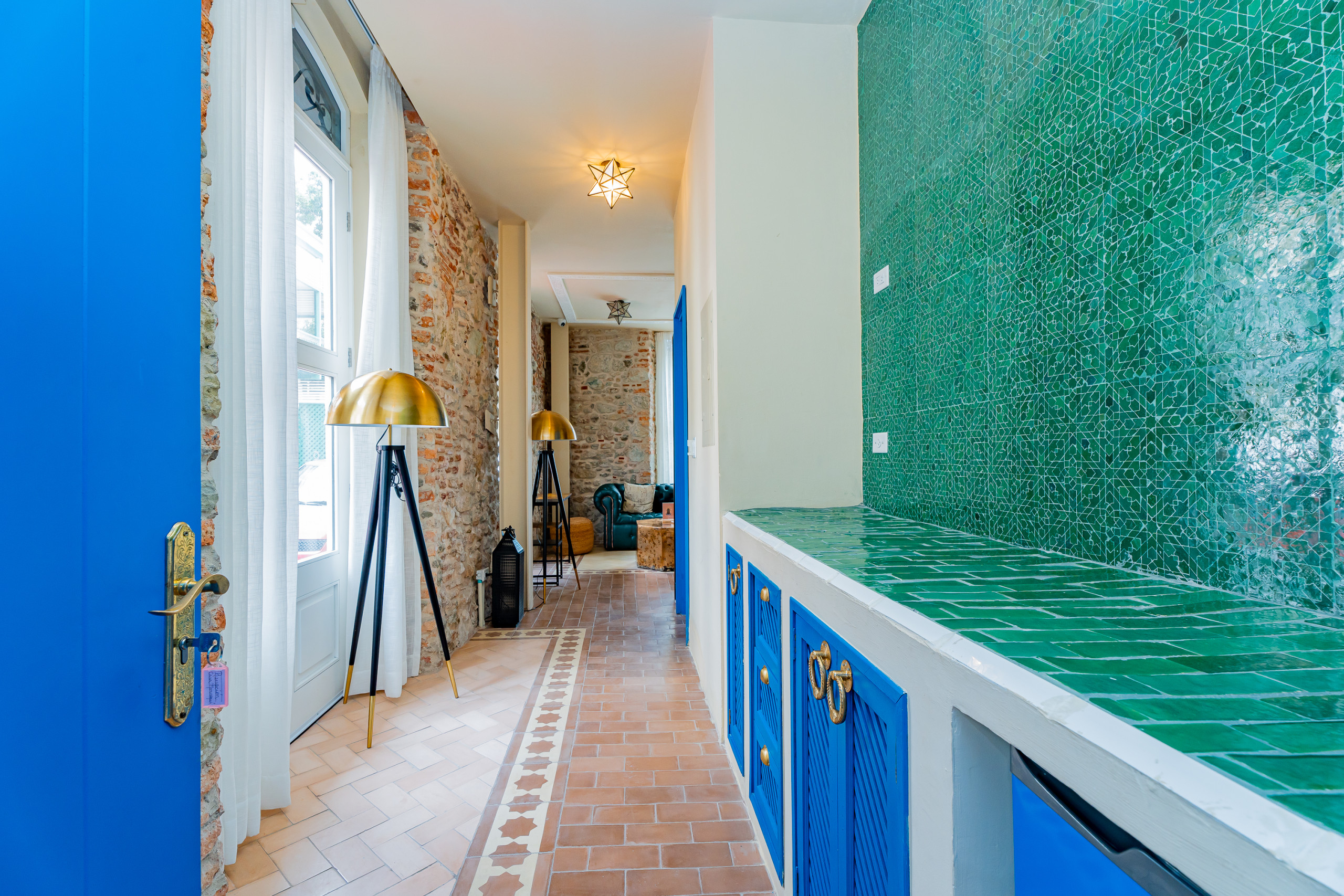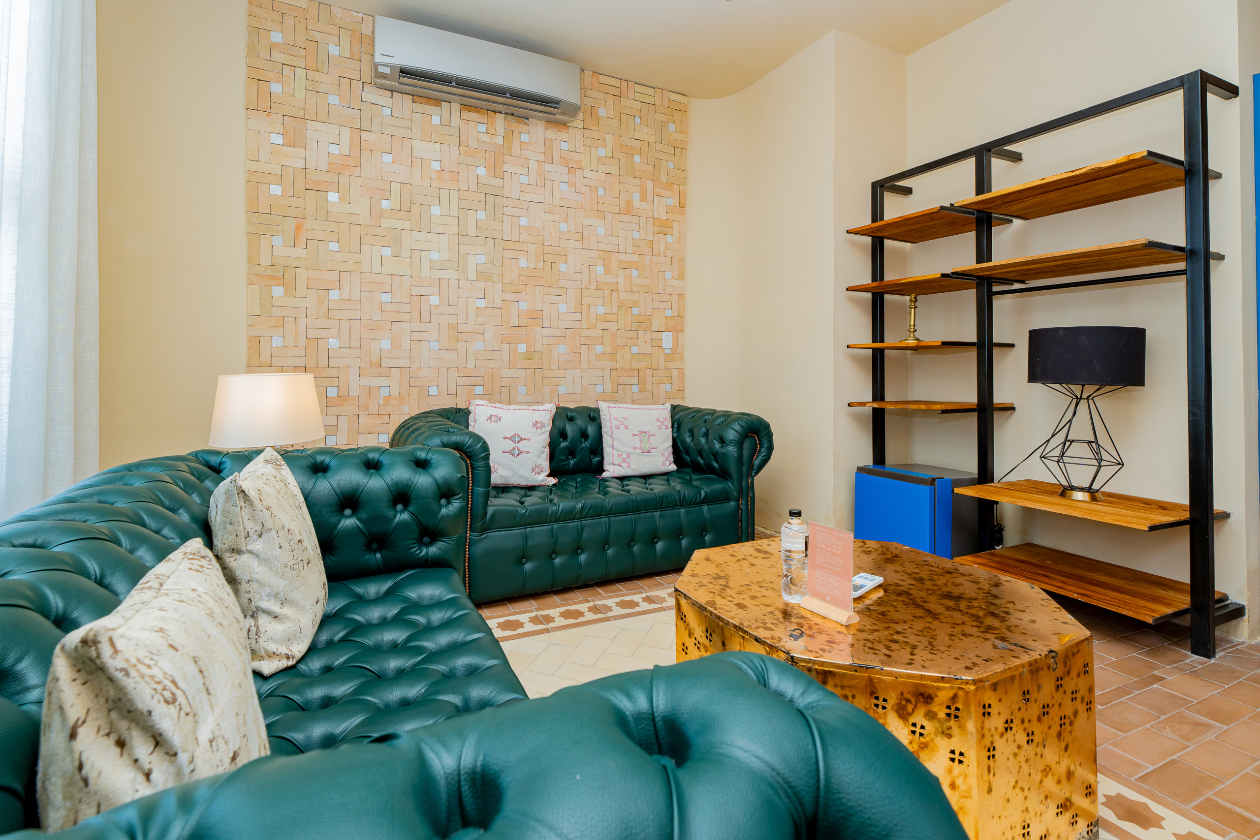 - Sala de Espera Compartida: elegante espacio que sido diseñado para ofrecerte comodidad al recibir invitados o disfrutar de un momento de descanso. Cuenta con sofás de cuero estilo capitoné, Wifi gratuito, una mesa tipo pupitre con silla ergonómica, tomacorriente para cargar dispositivos y servicio de guarda equipaje. Una combinación perfecta de encanto marroquí y funcionalidad moderna para trabajar o relajarte en un ambiente tranquilo y acogedor.