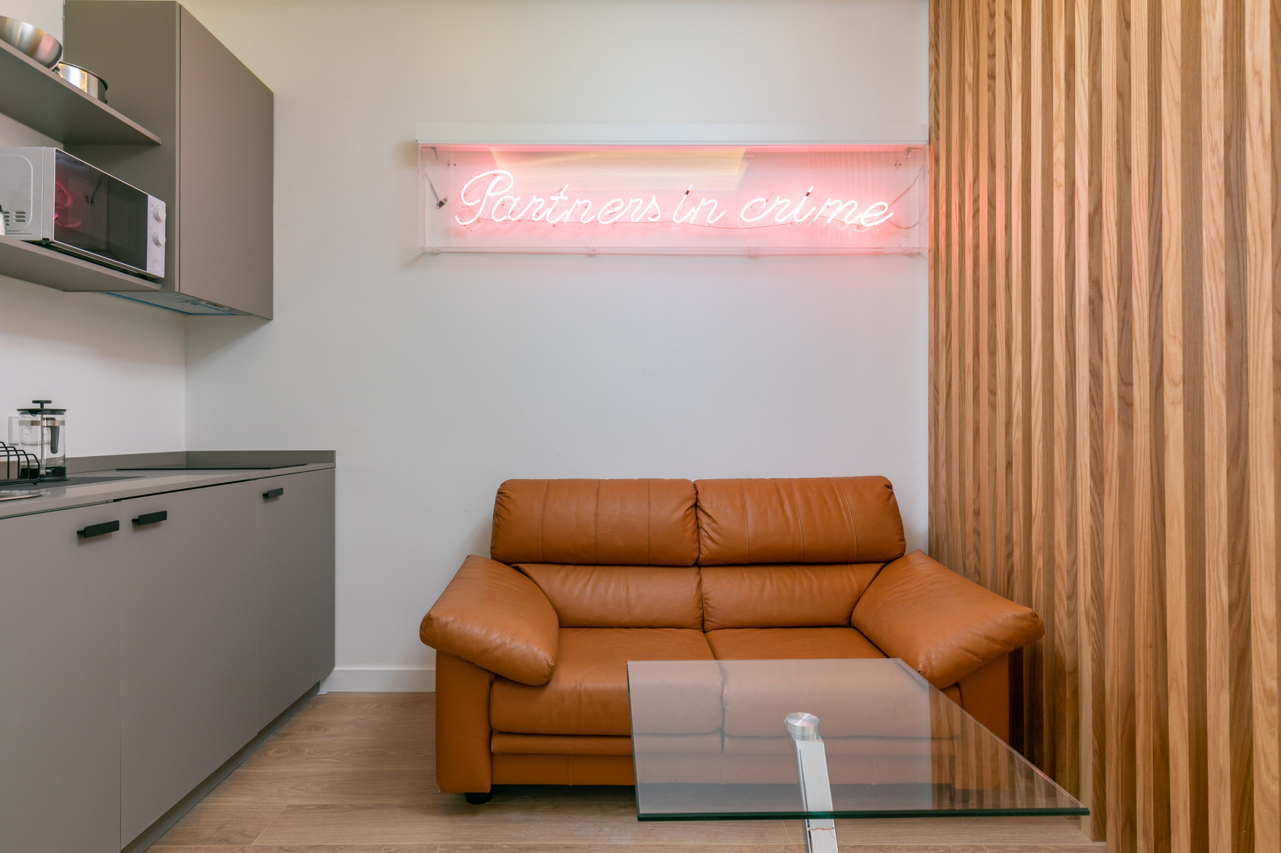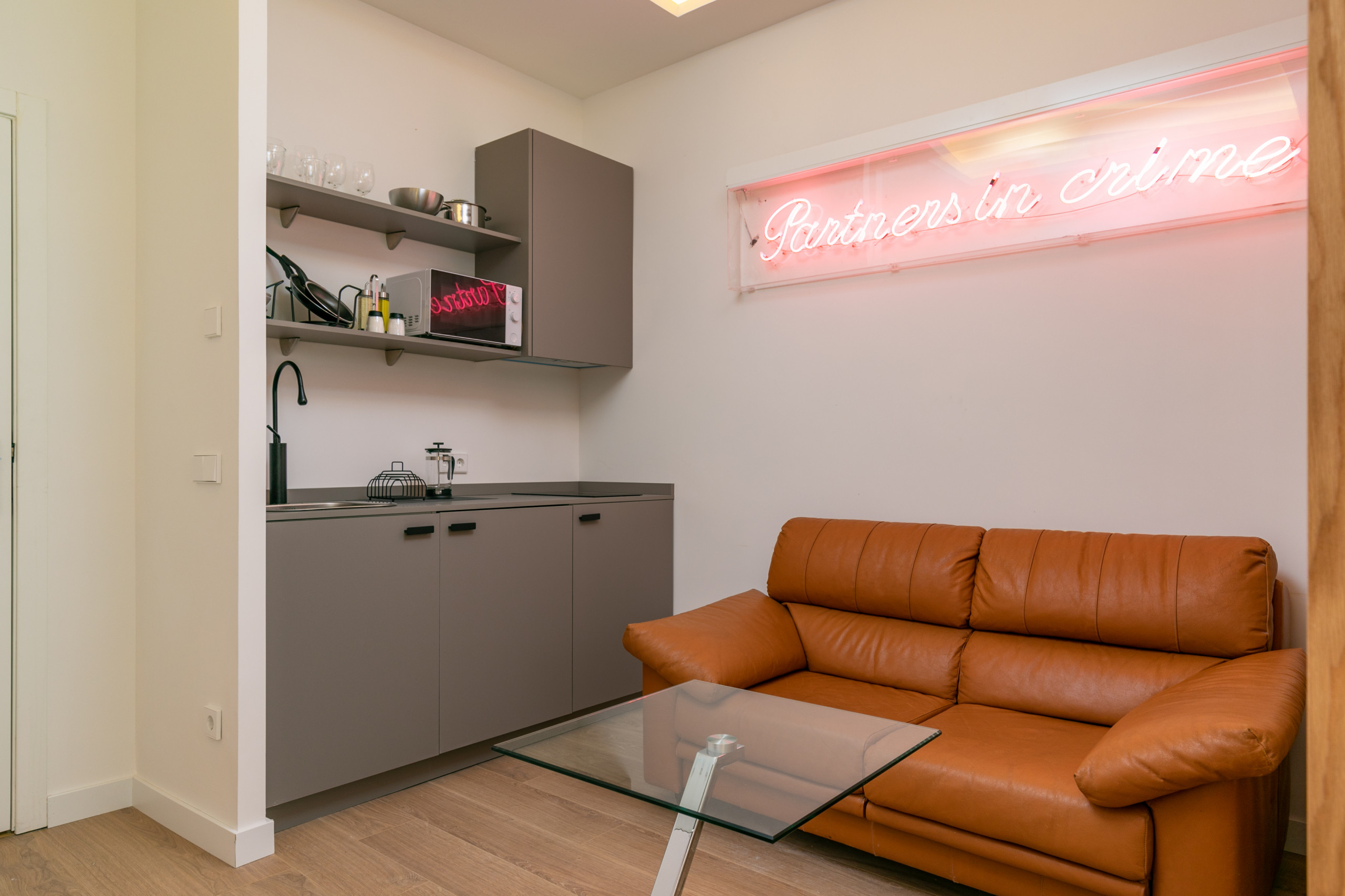 * En la entrada, está la cocina con un sofá y una TV pegada en la pared. No hay mesa de comedor, sino una pequeña mesa auxiliar de cristal.