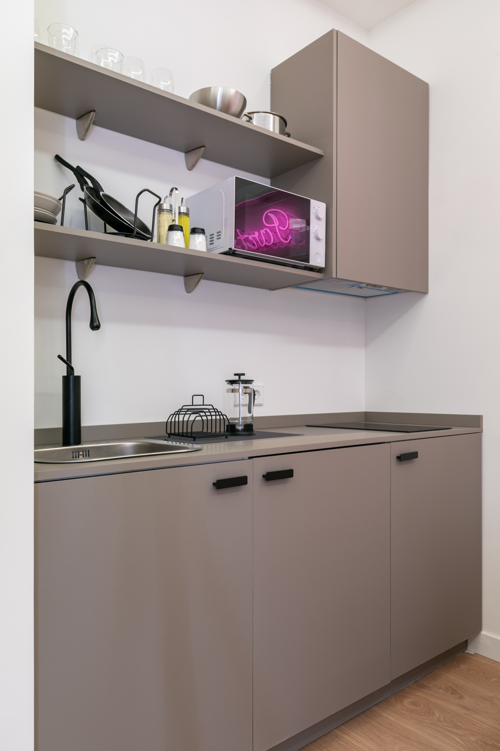 * No hay cocina pero tiene un espacio muy práctico con un refrigerador y un microondas donde podéis tomar algo gracias al menaje y la pequeña barra.