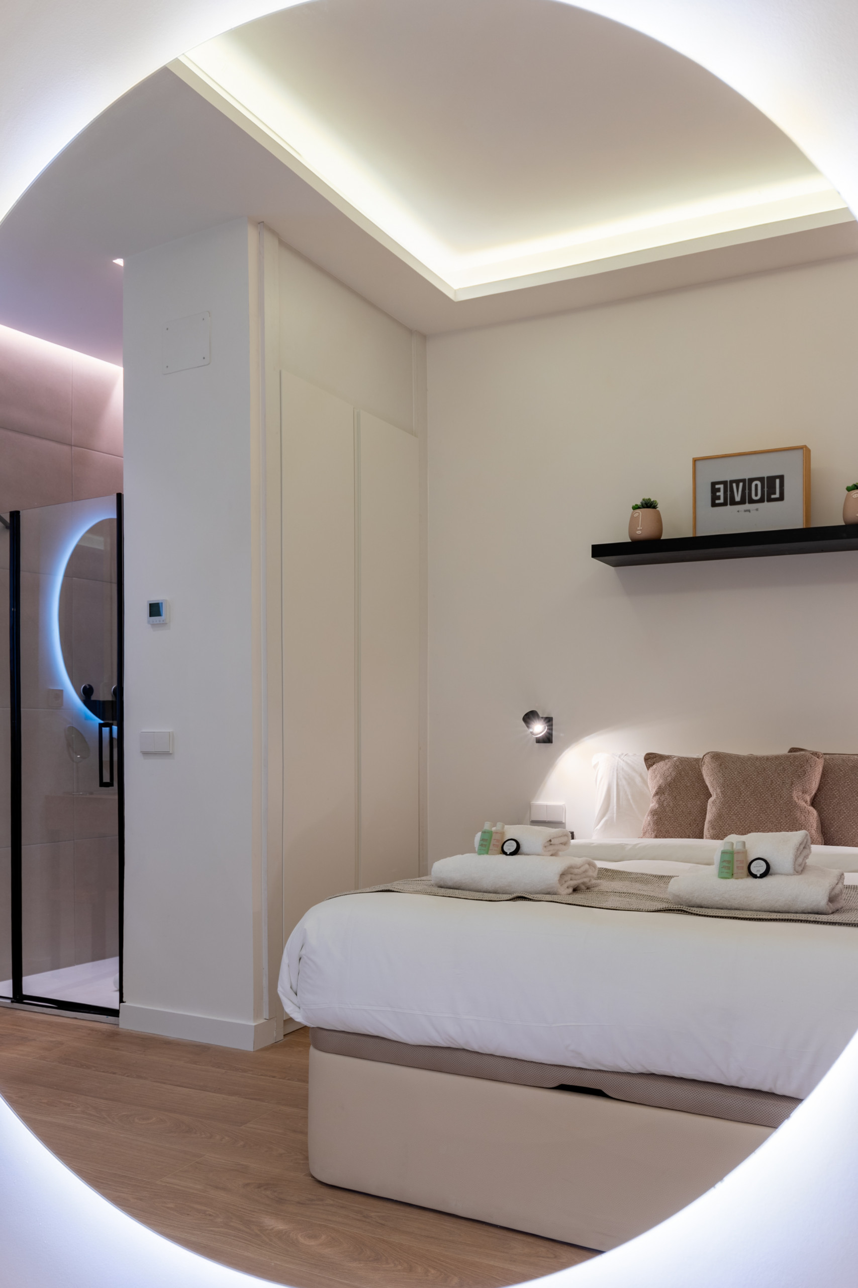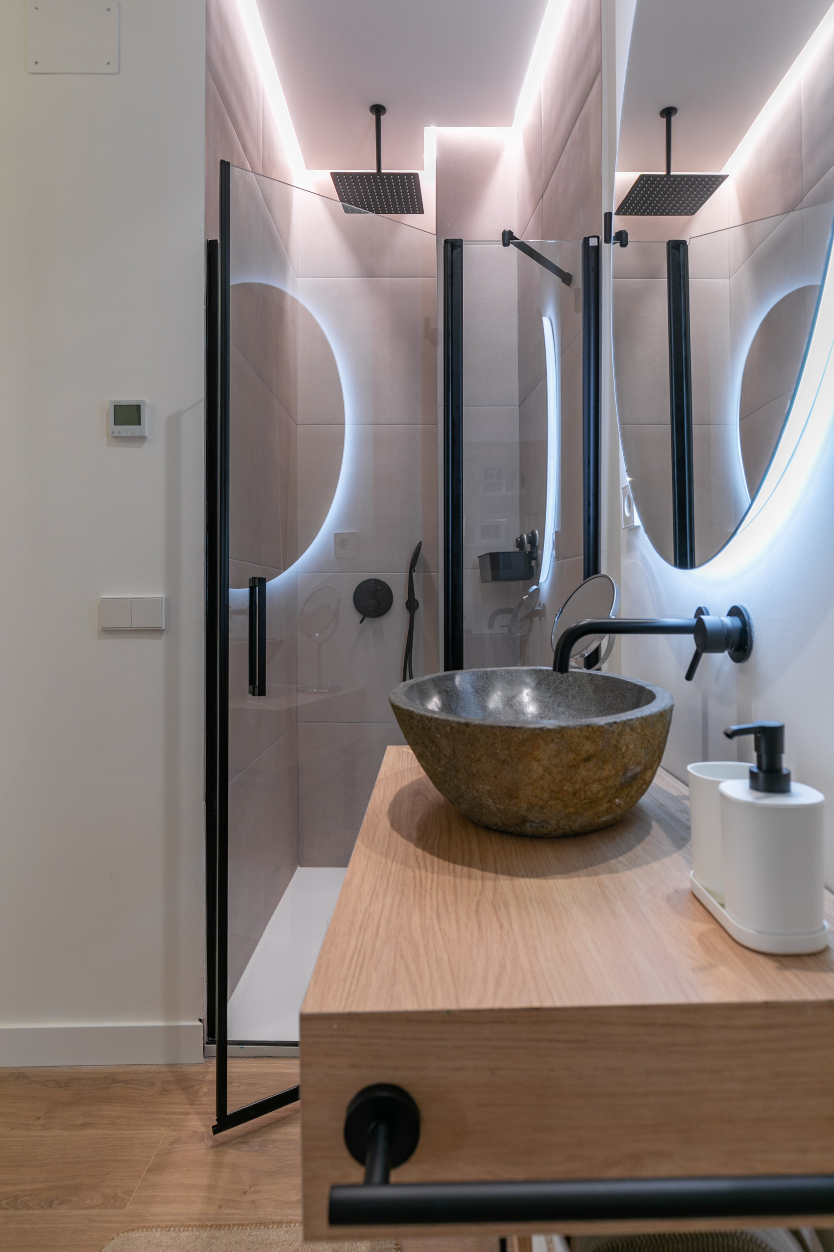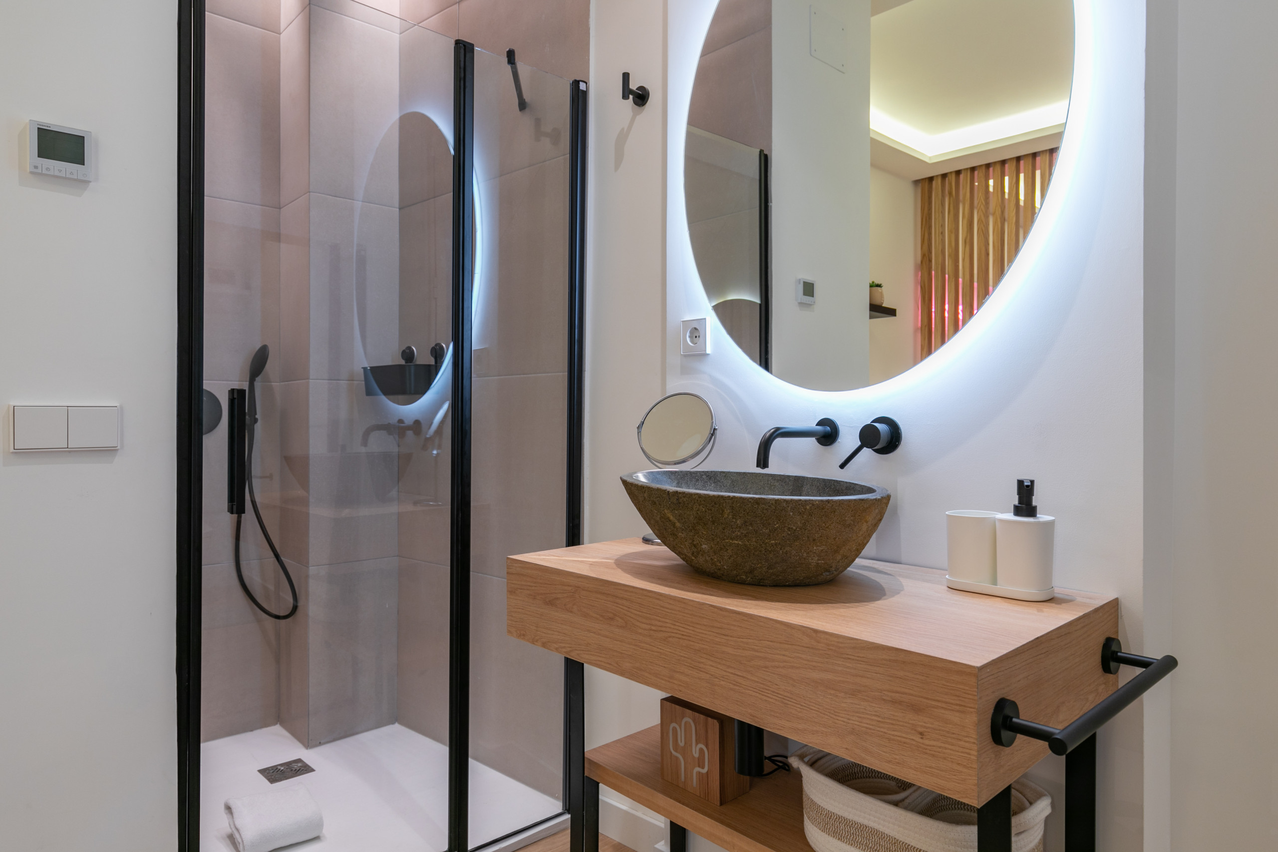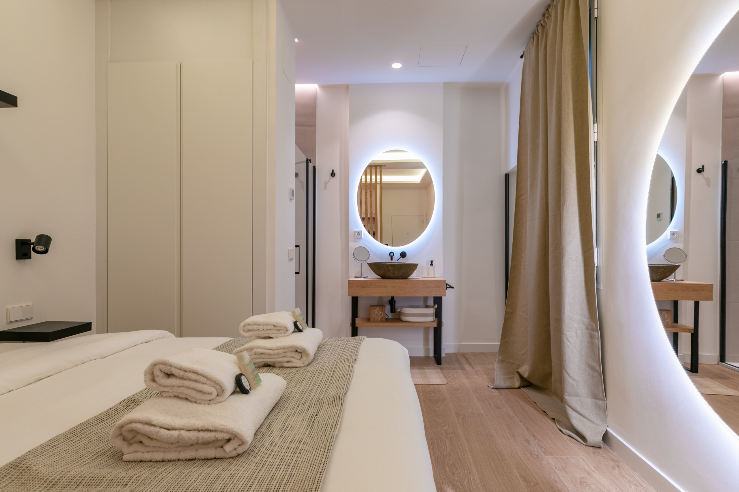 * Al lado izquierdo de la cama, separada por una pared, hay la ducha completa. Saliendo de la ducha, hay un lavabo (en espacio abierto).