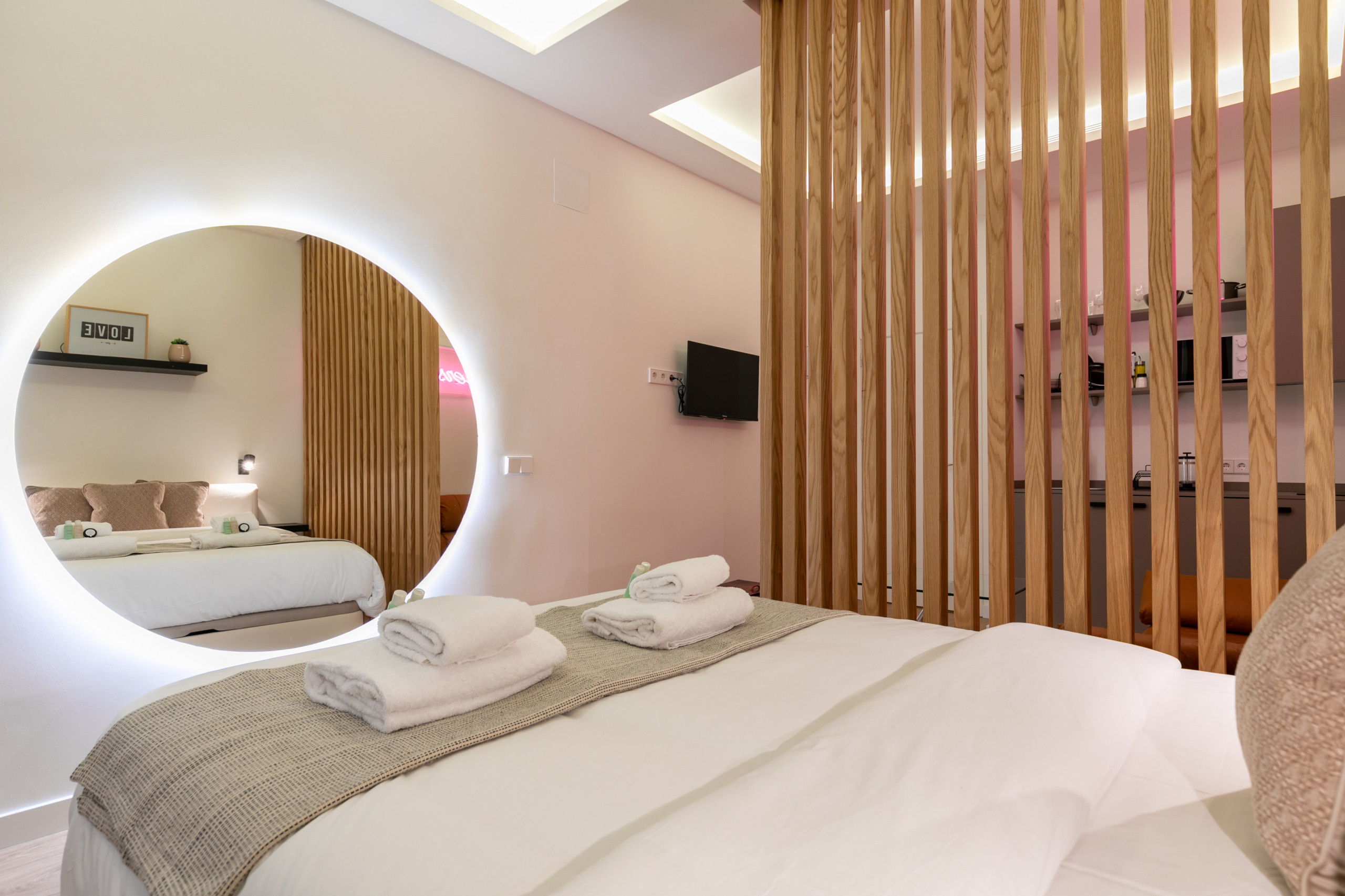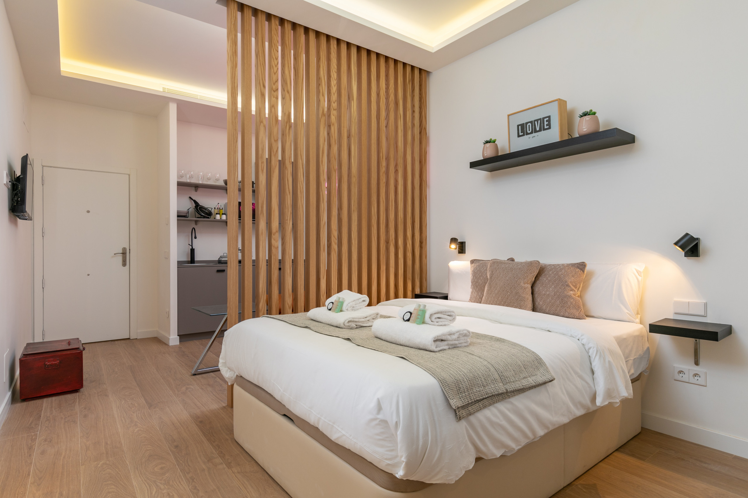 * No hay dormitorio, pero hay un espacio de descanso separado por una pared de madera medio-abierta. La cama es doble (150 x190).