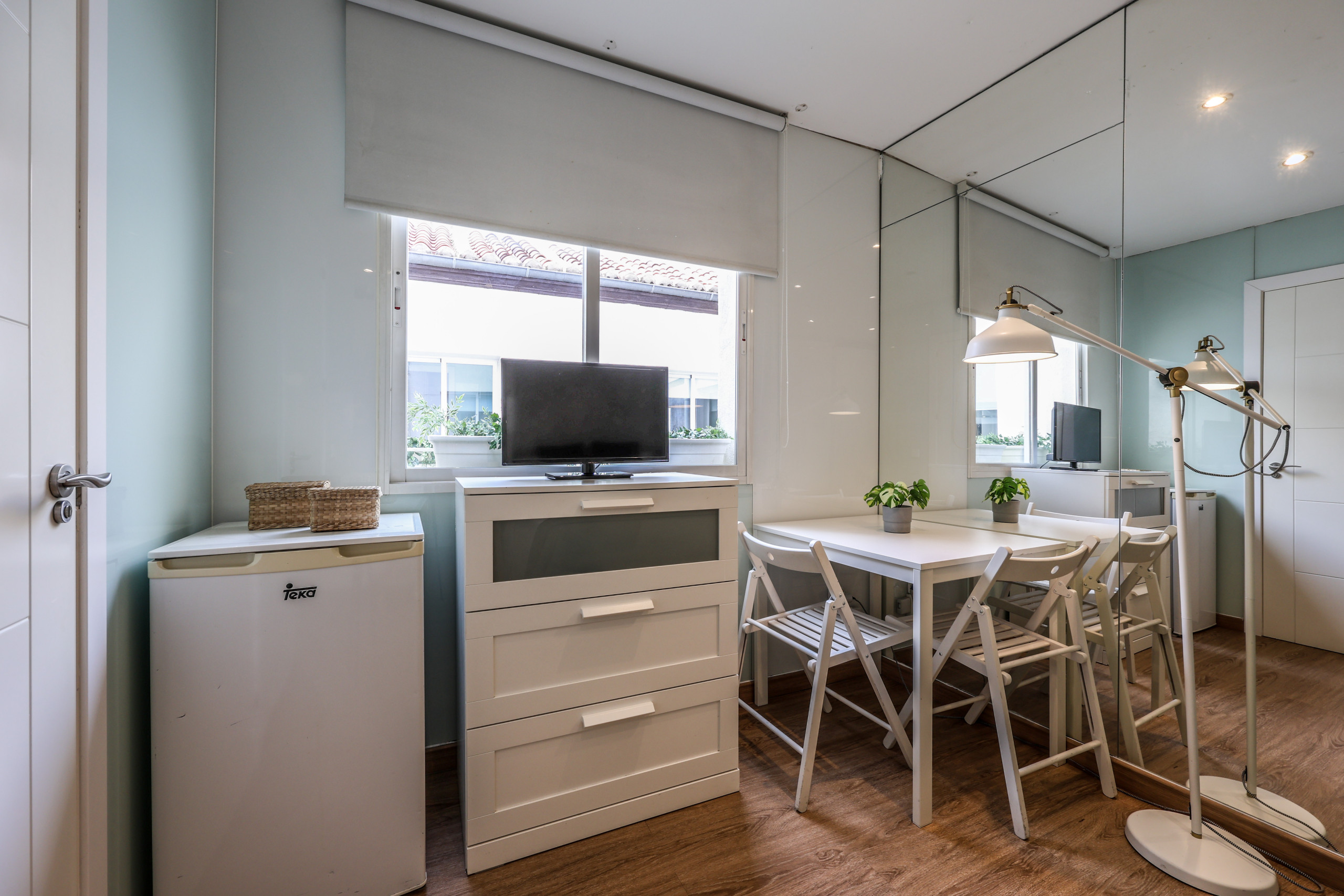 El espacio está conformado por una zona de salón con un cómodo sofá, Smart Tv ,mesas auxiliares y una mesa de comedor redonda para dos personas.