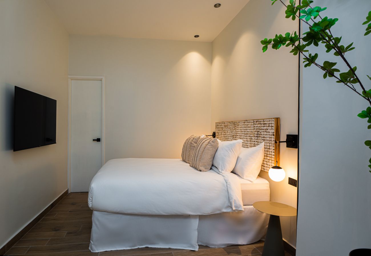 Dormitorio acogedor para dos personas, con balcón interior y vista a una espectacular piscina rodeada de vegetación tropical. Acceso a rooftop compartido con vistas panorámicas al Casco Antiguo, ideal para relajarte o compartir buenos momentos.