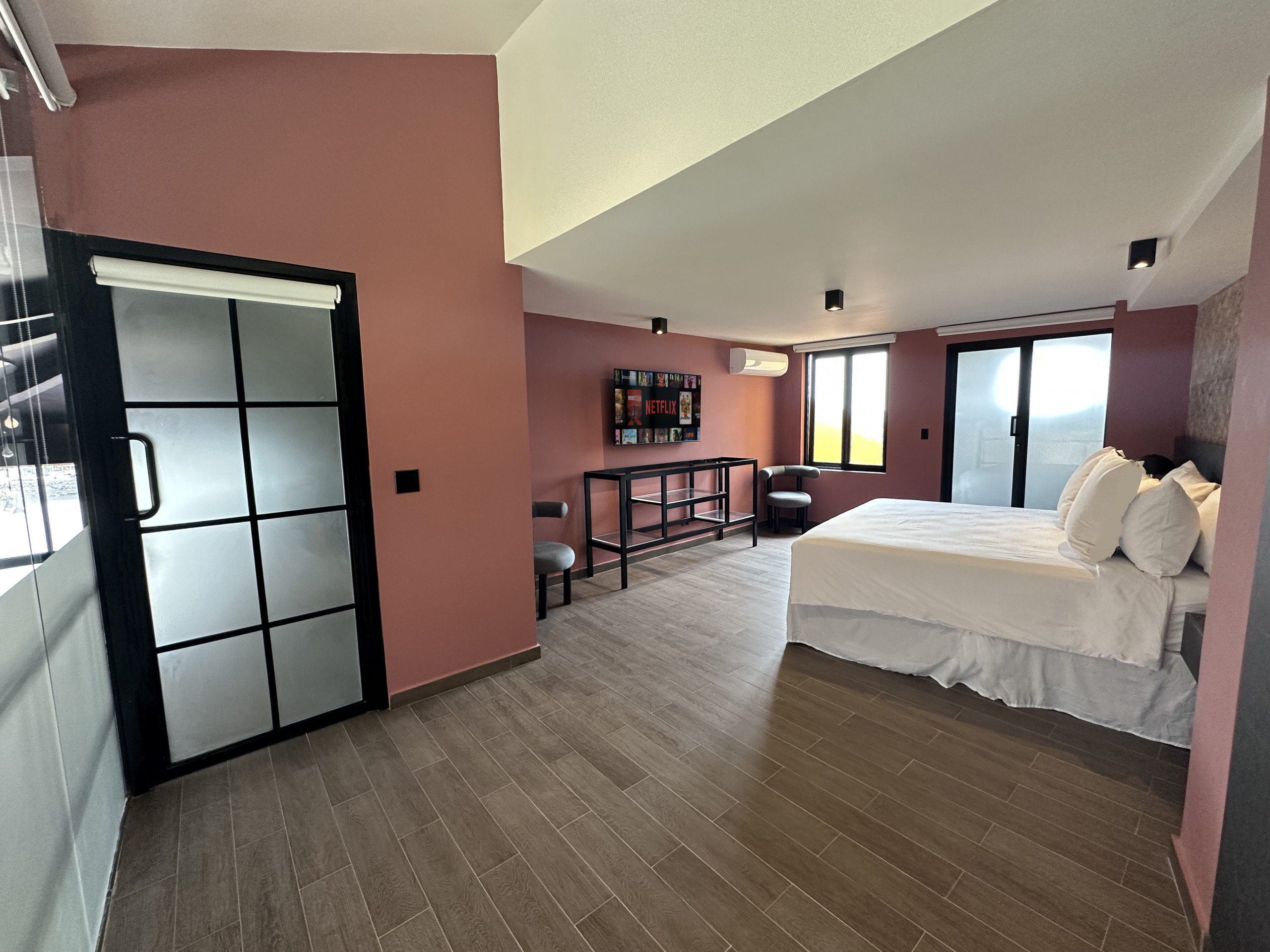 - Salón: Espacioso y elegante, equipado con aire acondicionado tipo Split, calefacción, wifi, Smart TV, mesa de trabajo, cómodo sofá y una barra estilo bar moderno, perfecta para cócteles, charlas y momentos inolvidables entre amigos.