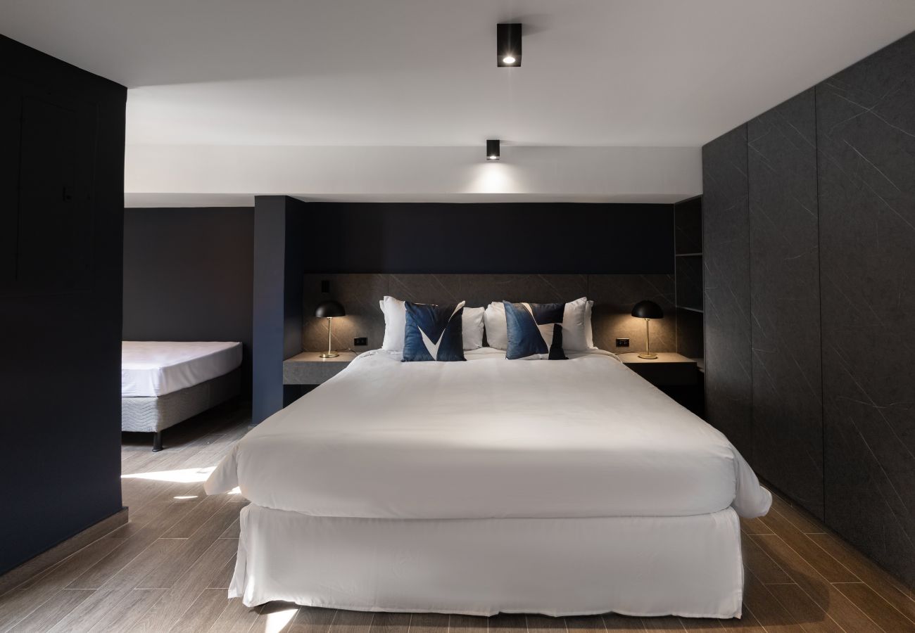 - Dormitorio 1: Equipado con 1 cama King size, 1 cama twin, Smart TV, aire acondicionado, espacio para guardar la ropa, perchas, plancha, tabla de planchar, persianas o cortinas opacas, calefacción, servicios básicos, ropa de cama, lámpara de noche, espejo.