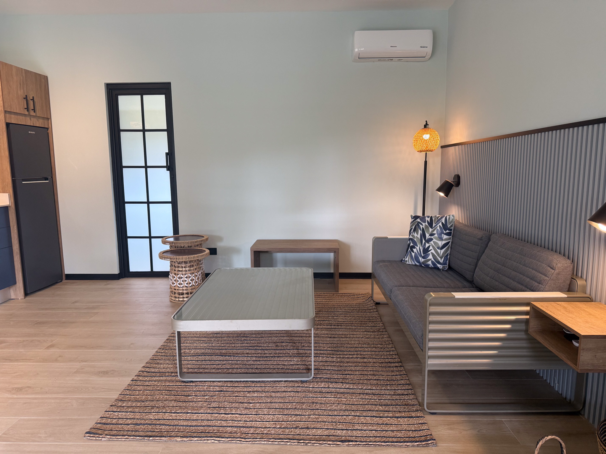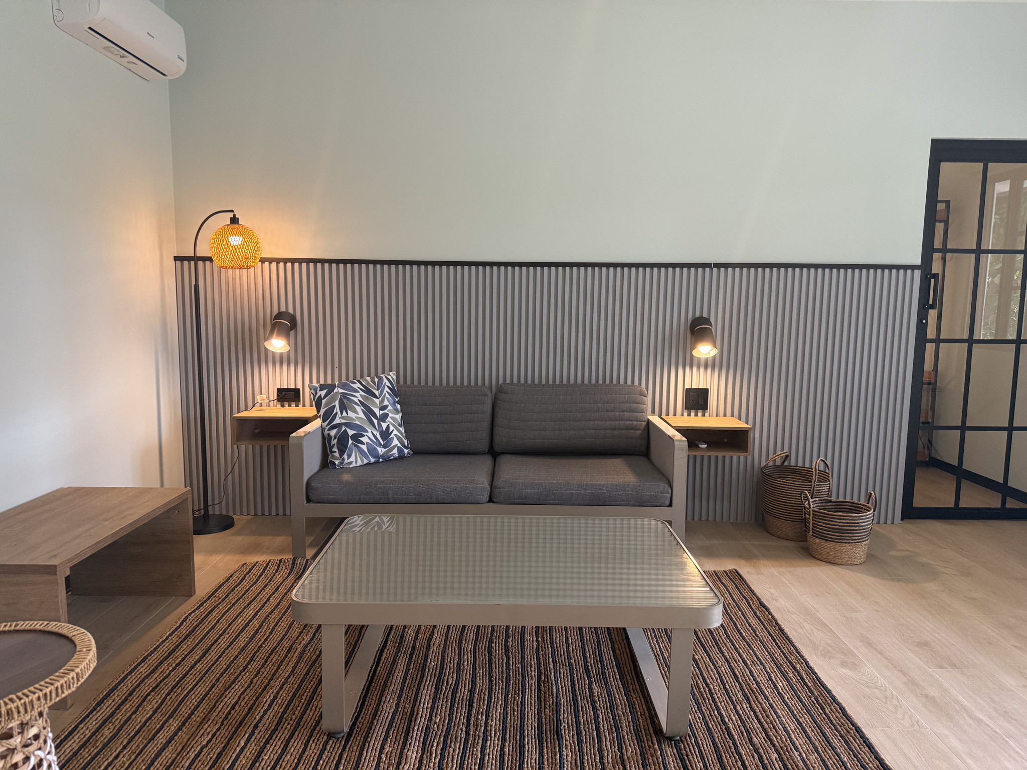 - Sala de estar: Espacio cómodo con sofá y mesa de comedor. La sala no cuenta con aire acondicionado ni TV.