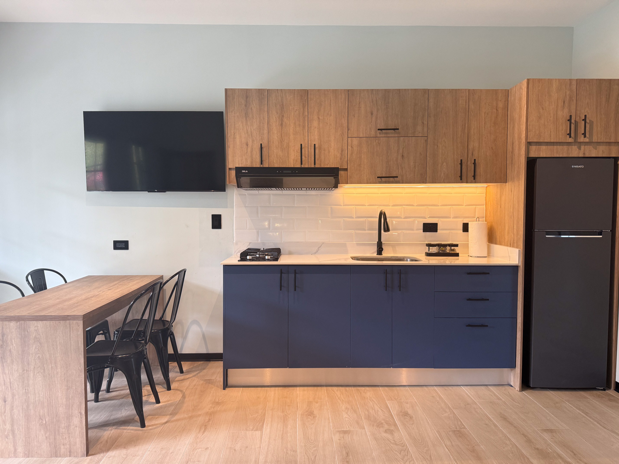 - Cocina americana equipada: Cocina a gas con refrigerador y congelador, microondas, cafetera, hervidor de agua, café, platos, cubiertos, copas de vino y utensilios básicos. Incluye mesa de comedor y productos de limpieza.