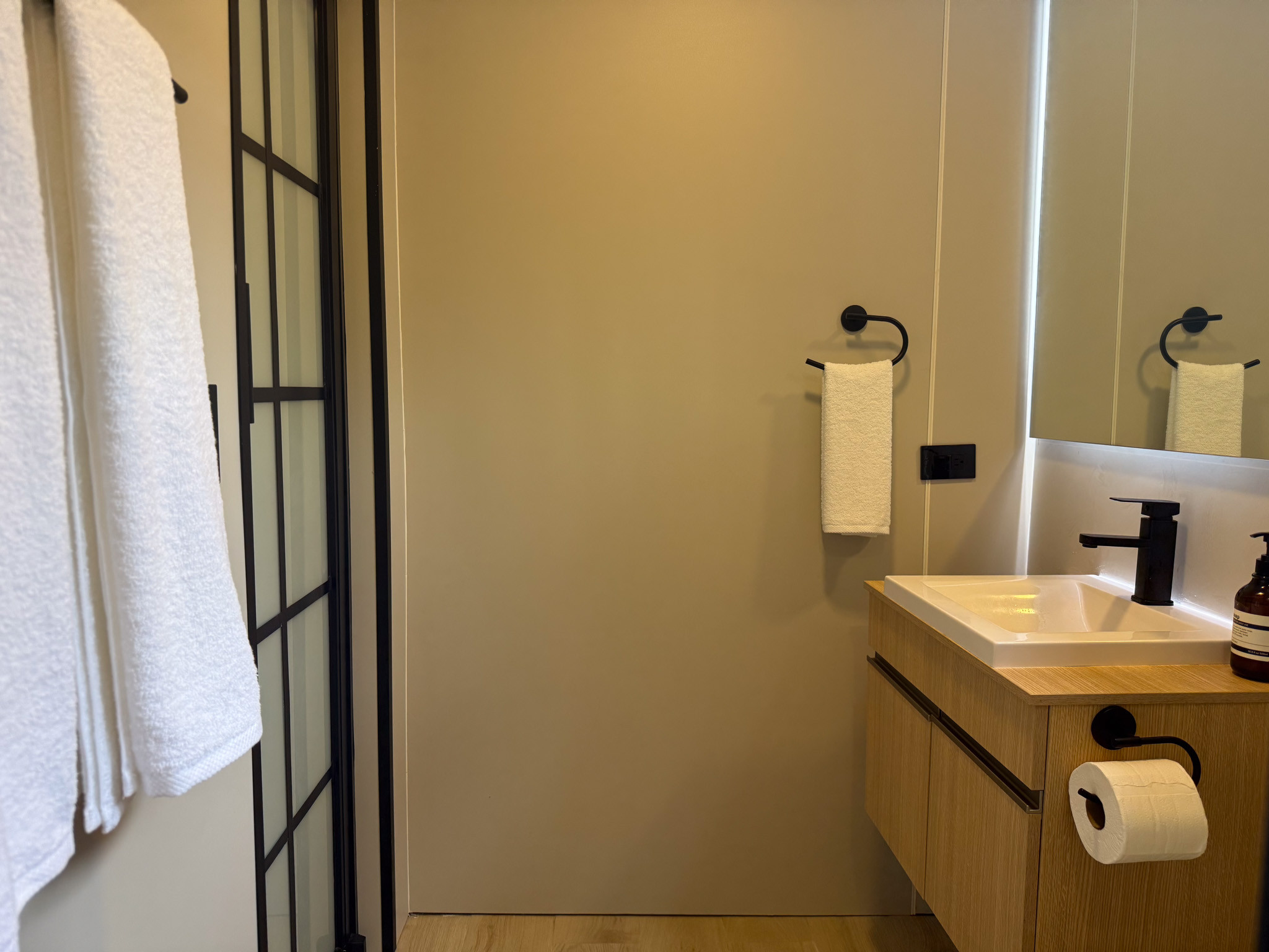 - 2 Baños: 1 baño en suite, 1 baño con acceso desde la sala. Ambos incluyen ducha con agua caliente, champú, gel de ducha, secador de cabello, toallas incluidas y ventana para ventilación natural.