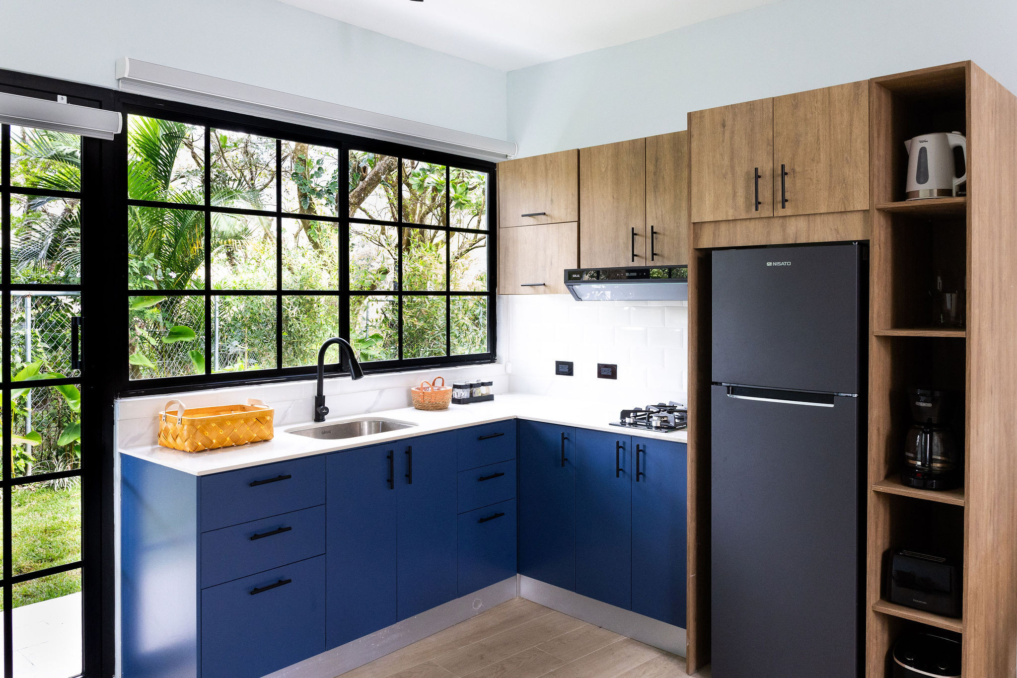 - Cocina americana equipada: cocina a gas con refrigerador y congelador, microondas, freidora de aire (airfryer), cafetera, hervidor de agua, café, platos, cubiertos, copas de vino, utensilios básicos, mesa de comedor y productos de limpieza.