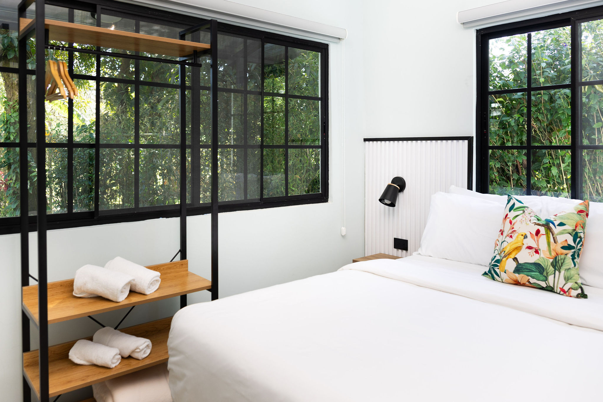 - Dormitorios (2): Cada habitación cuenta con cama Queen, aire acondicionado, ventilador de techo, persianas o cortinas opacas, ropa de cama, almohadas y mantas adicionales. Dispone de TV, armario o espacio para guardar ropa, perchas y detectores de humo y monóxido de carbono.