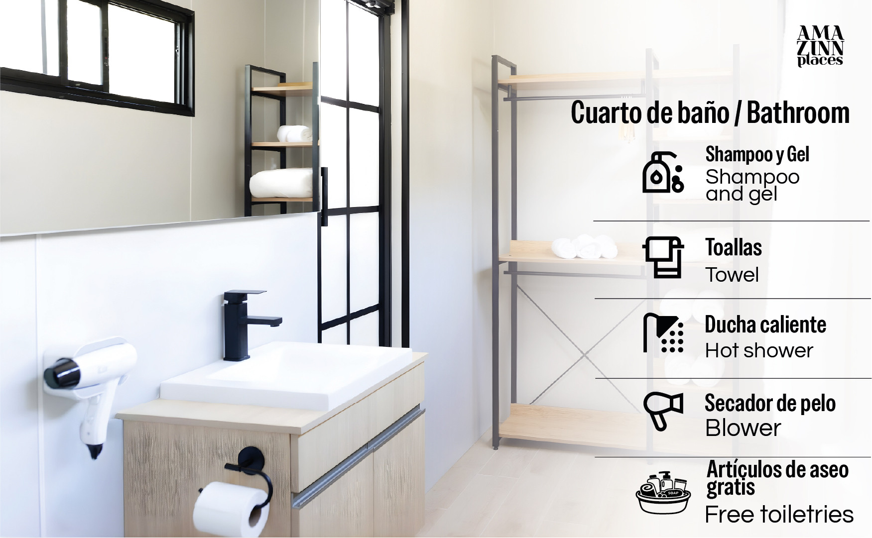 - 2 Baños: 1 baño en suite, 1 baño con acceso desde la sala. Ambos incluyen ducha con agua caliente, champú, gel de ducha, secador de cabello, toallas incluidas y ventana para ventilación natural.