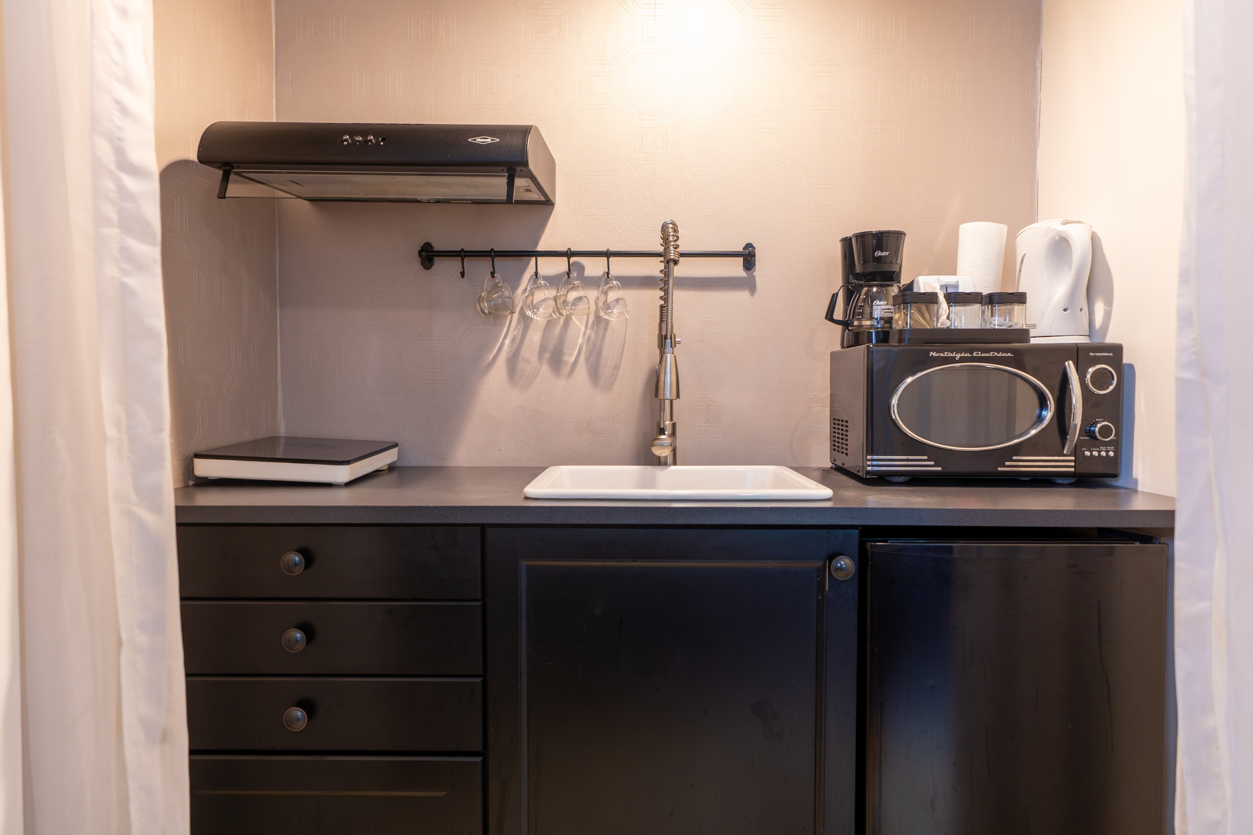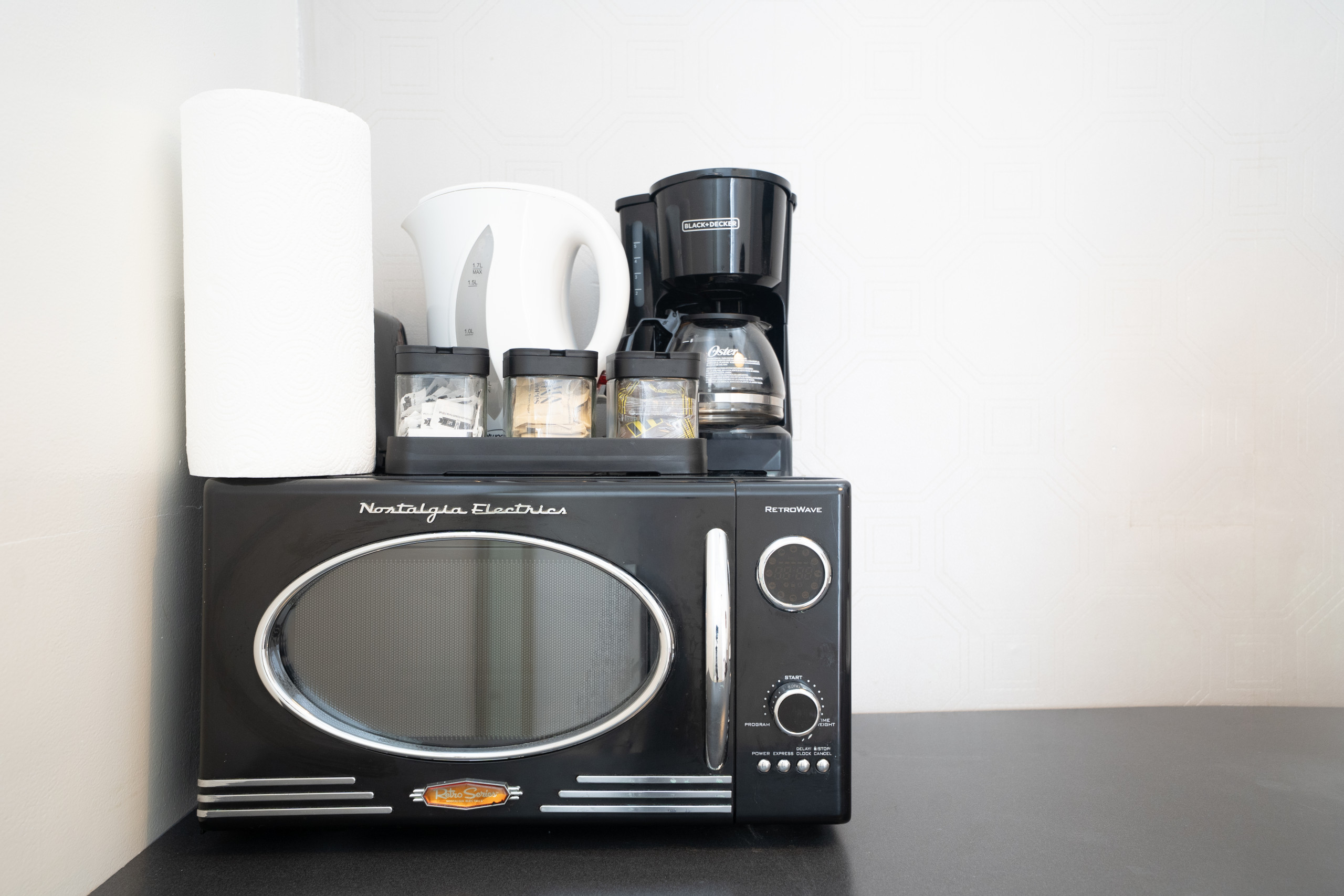 - Kitchenette funcional: Espacio práctico para preparaciones sencillas, equipado con cafetera, microondas, mini frigorífico, hervidor de agua, licuadora, tostadora, copas de vino, platos, cubiertos y utensilios básicos. Incluye café, sal, azúcar, té y aceite.
