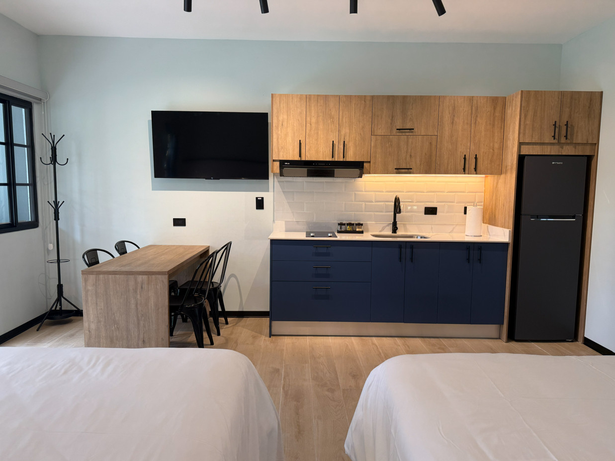 - Dormitorio: Estudio amplio y confortable con 2 camas Queen, ropa de cama incluida, aire acondicionado, ventilador de techo y persianas o cortinas opacas para un descanso óptimo. Dispone de escritorio con silla, zona de trabajo con buena iluminación, TV Smart y wifi de alta velocidad. Incluye armario o espacio para guardar ropa con perchas, plancha, almohadas y mantas adicionales. Cuenta con detectores de humo y monóxido de carbono, además de seguros en ventanas.