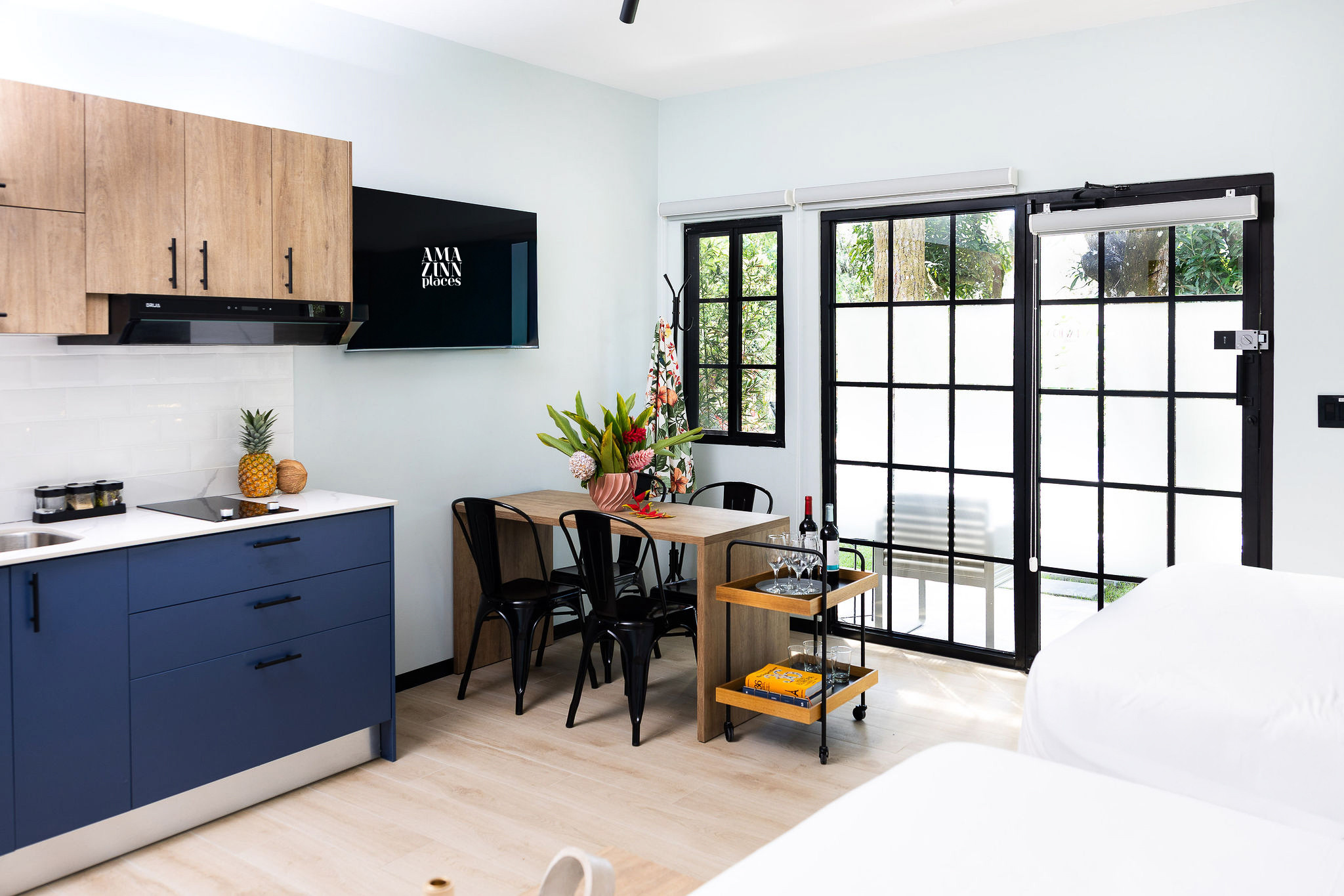 - Cocina americana totalmente equipada: Cocina eléctrica con refrigerador y congelador, microondas, café, cafetera, hervidor de agua, platos, cubiertos, copas de vino y utensilios básicos de cocina. Incluye mesa de comedor, productos de limpieza, ventilador de techo y zona de trabajo con enchufe cercano y wifi.