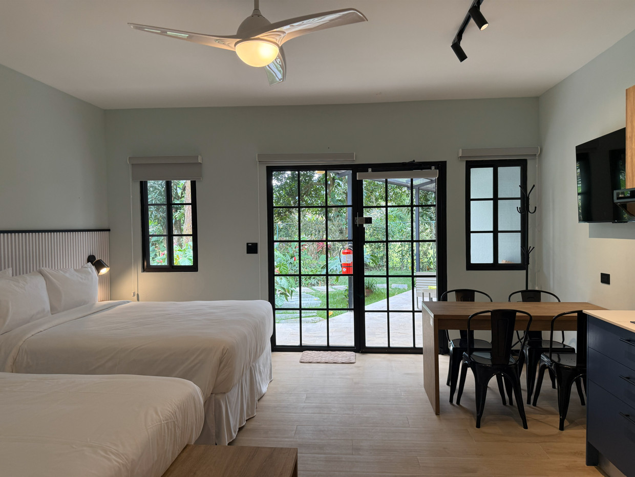 - Dormitorio: Estudio amplio y confortable con 2 camas Queen, ropa de cama incluida, aire acondicionado, ventilador de techo y persianas o cortinas opacas para un descanso óptimo. Dispone de escritorio con silla, zona de trabajo con buena iluminación, TV Smart y wifi de alta velocidad. Incluye armario o espacio para guardar ropa con perchas, plancha, almohadas y mantas adicionales. Cuenta con detectores de humo y monóxido de carbono, además de seguros en ventanas.