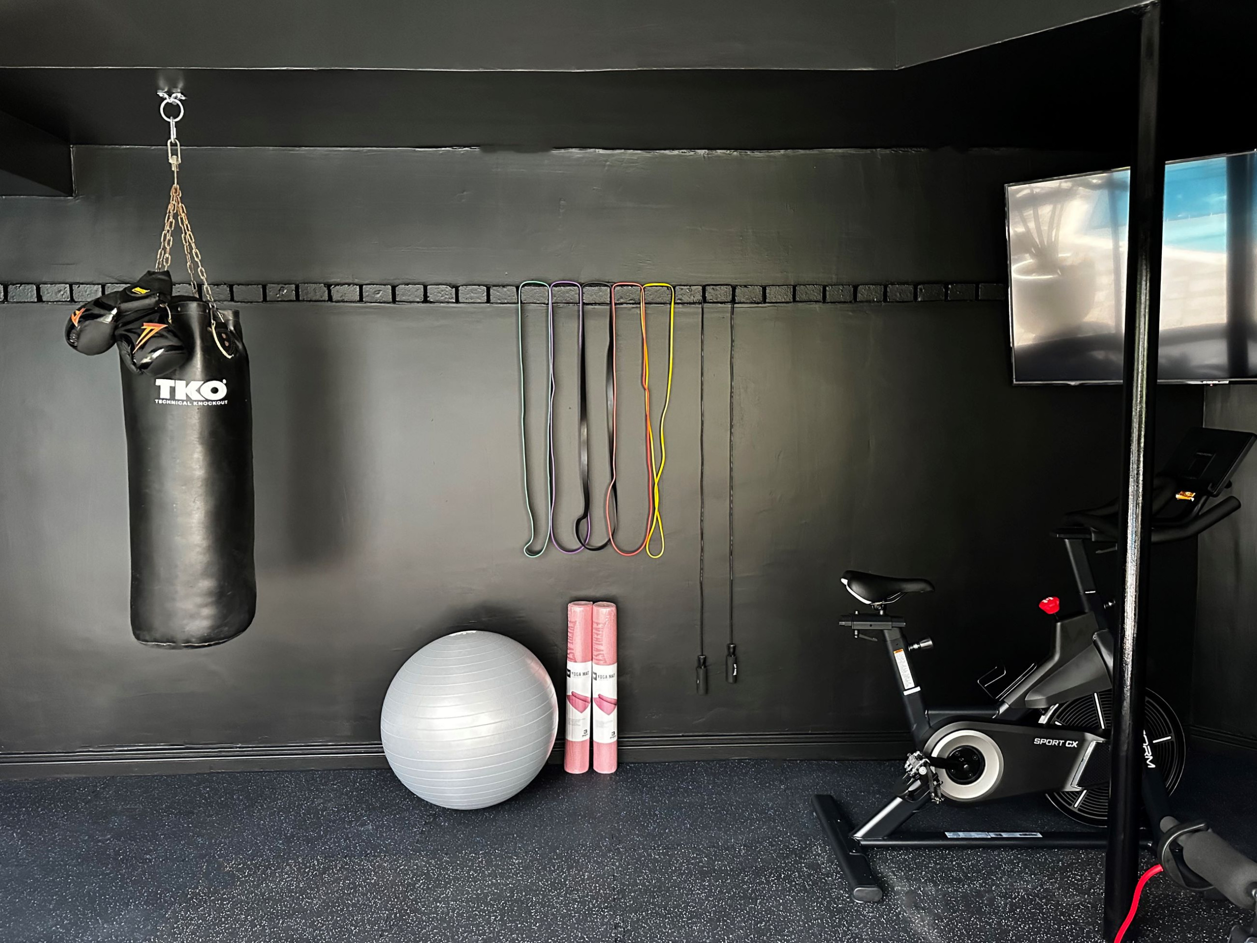 - Gimnasio completo:máquina de correr, bicileta estática, módulo con pesas, TV, pelota de yoga y accesorios como bandas elásticas.