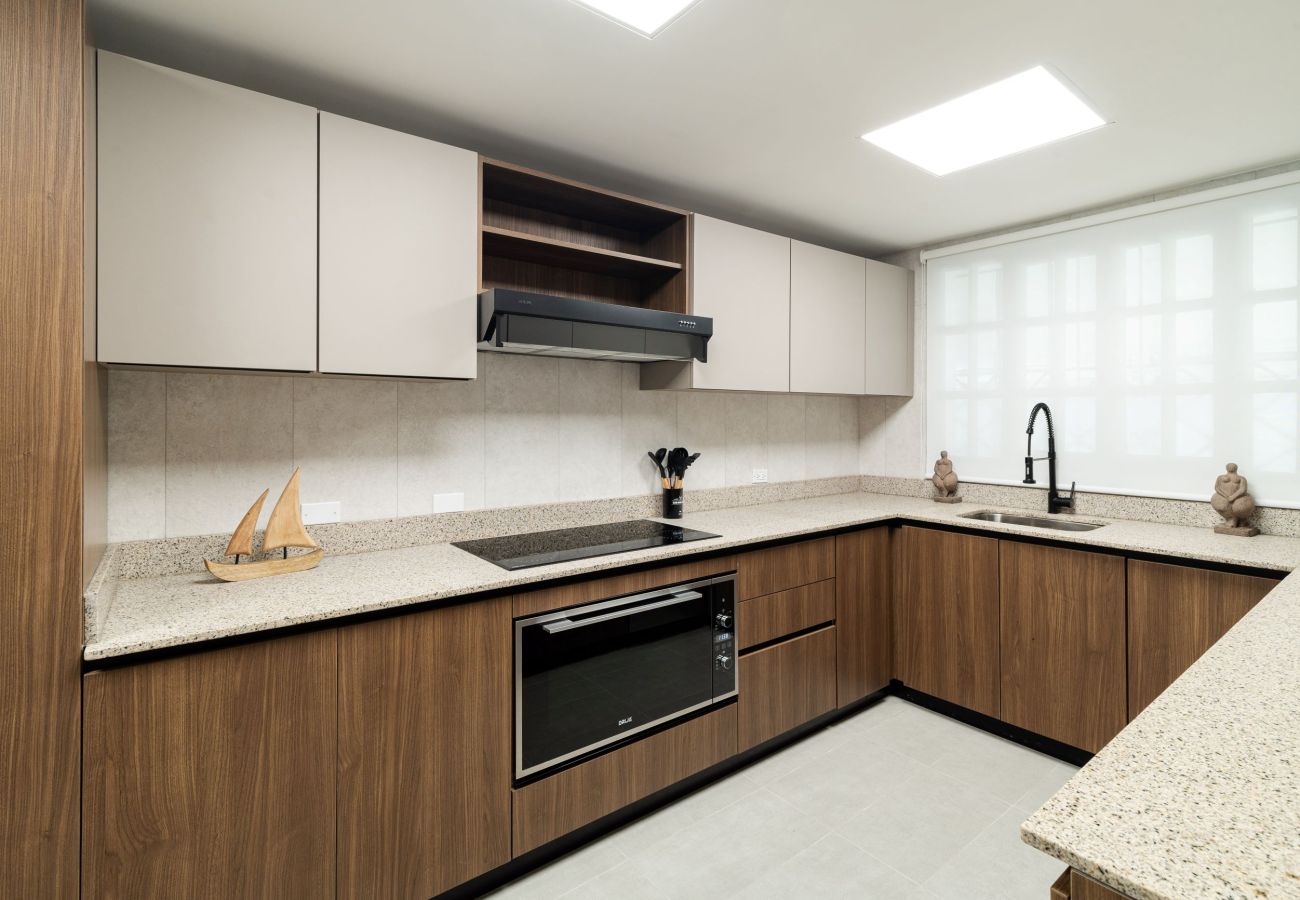 - Cocina: mesa de comedor , congelador, frigorífico, horno, lavavajillas, microondas, patio o balcón, platos y cubiertos, persianas o cortinas opacas, bandeja de repostería, batidora, café, cafetera, , copas de vino, exprimidor, hervidor de agua, , productos de limpieza, seguros para ventanas, tostadora, TV, utensilios básicos de cocina y ventiladores portátiles.