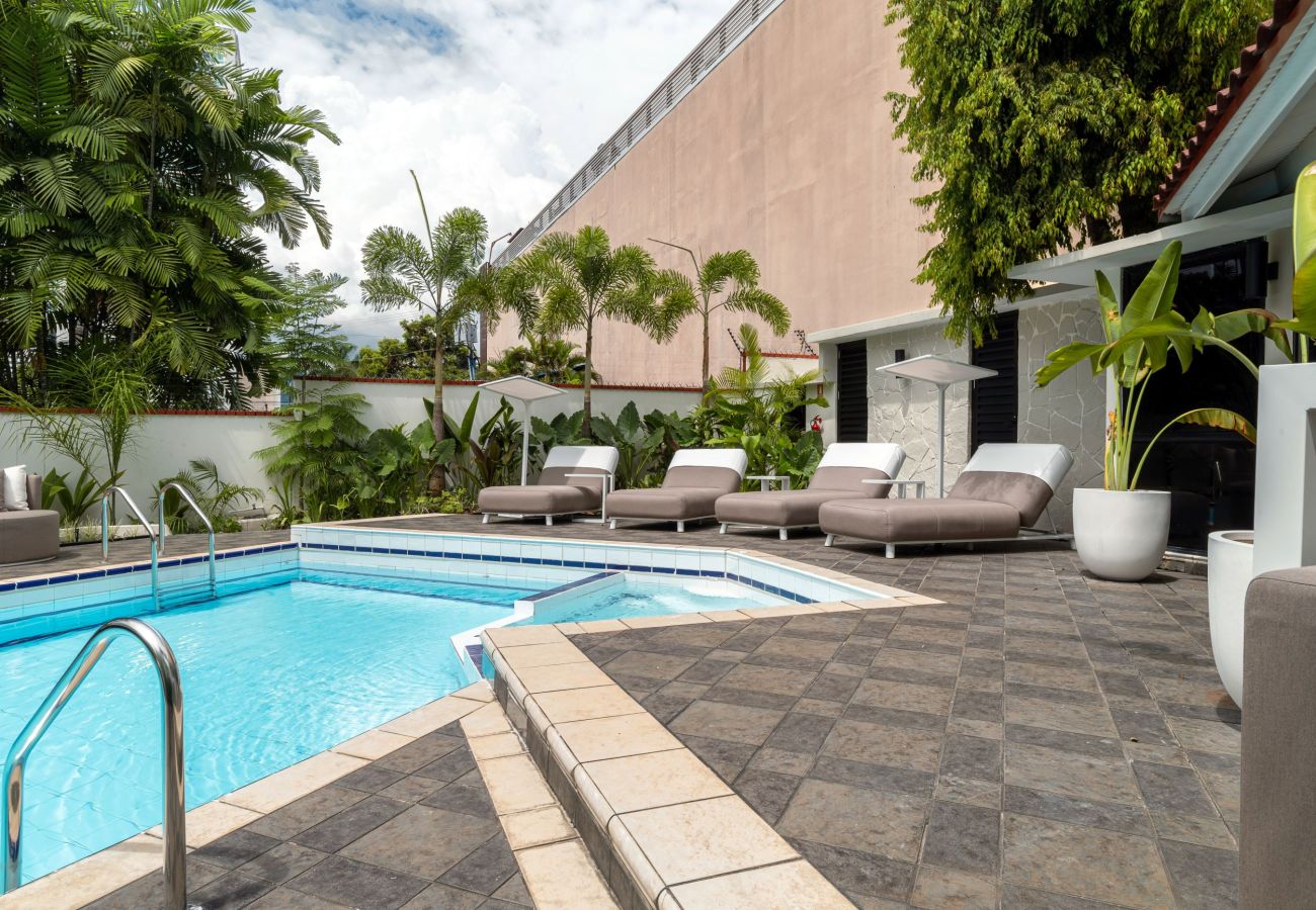 - Patio: jacuzzi, piscina, gimnasio en el bohío, comedor exterior, ducha exterior, mobiliario exterior, cuarto de baño completo y barbacoa.