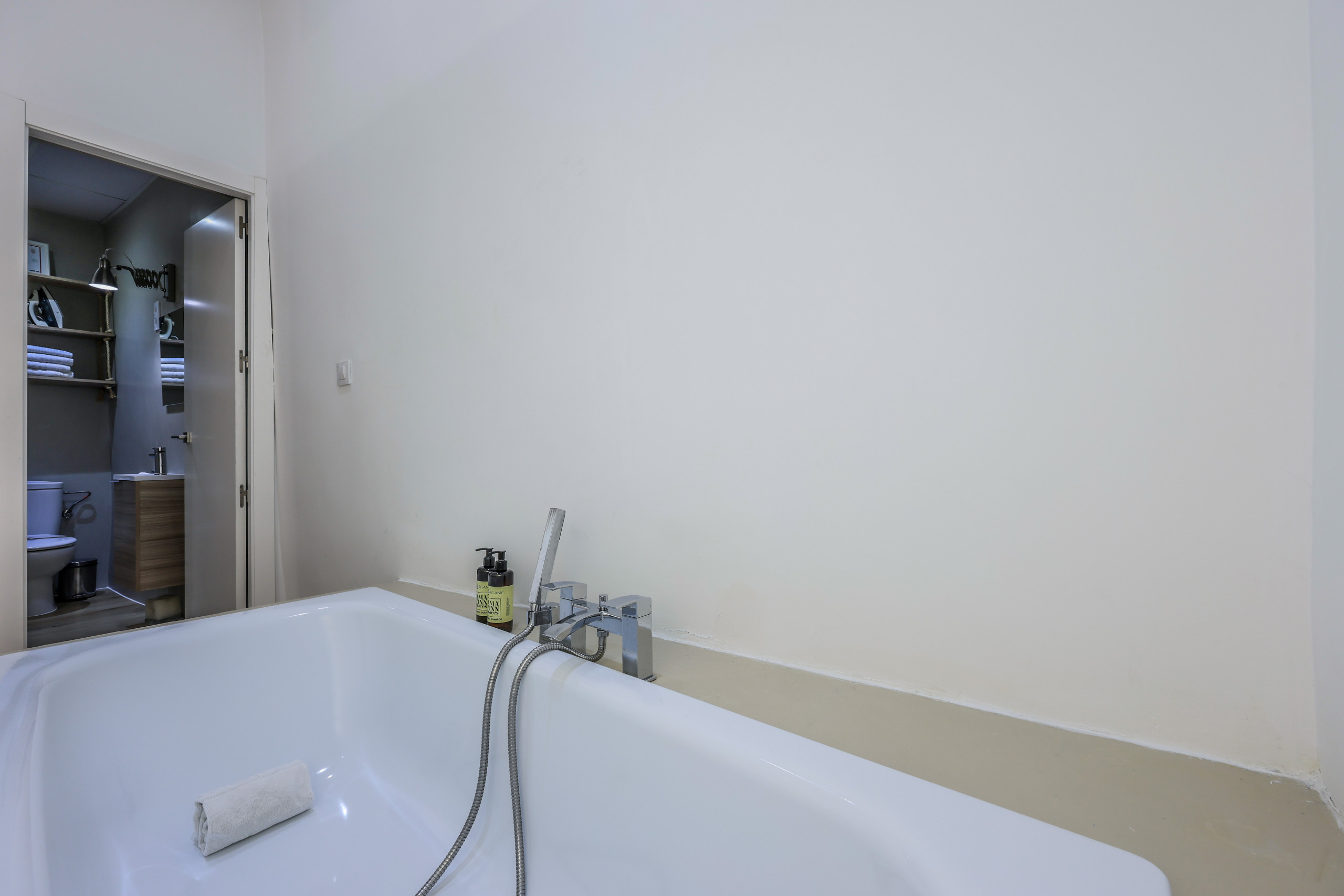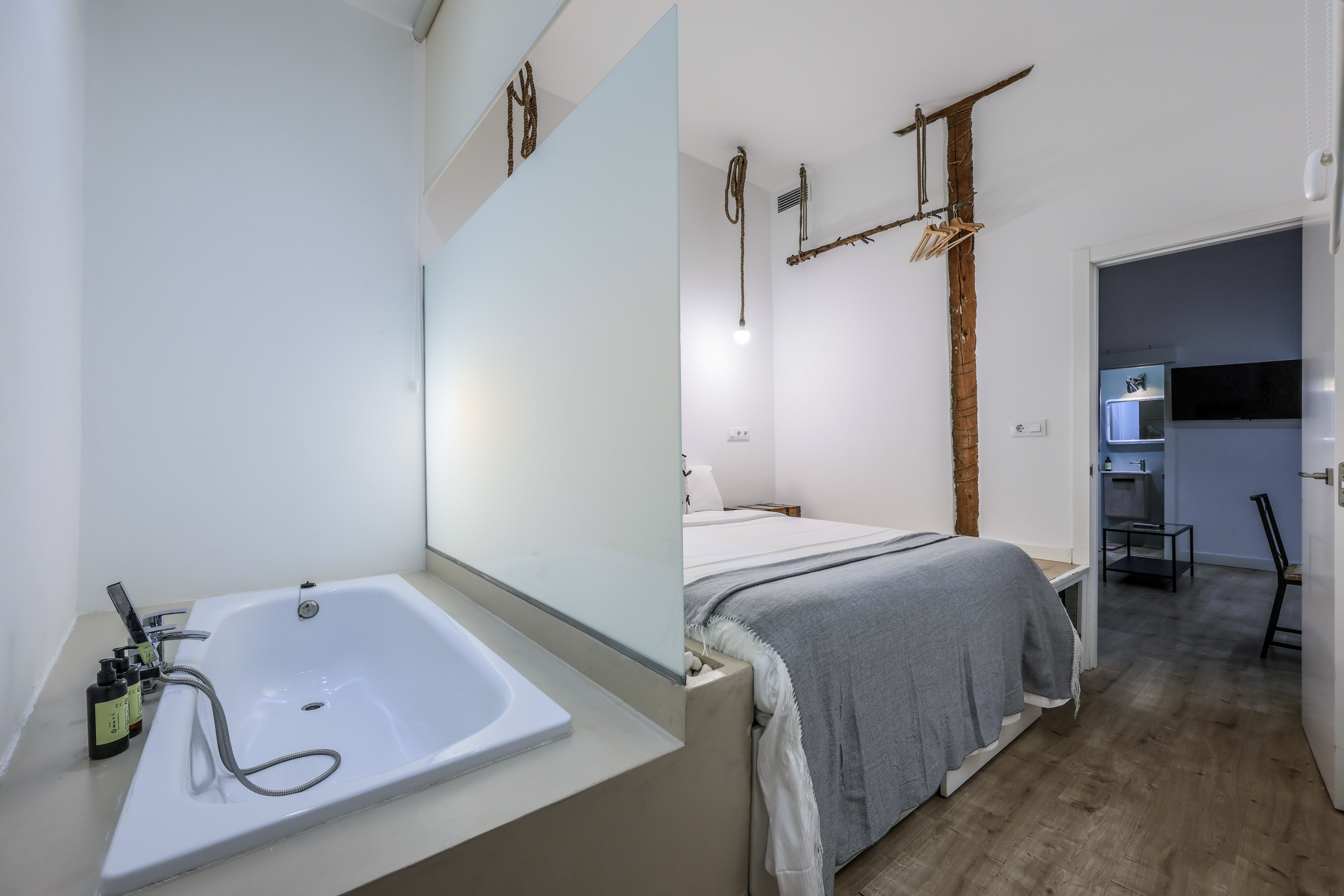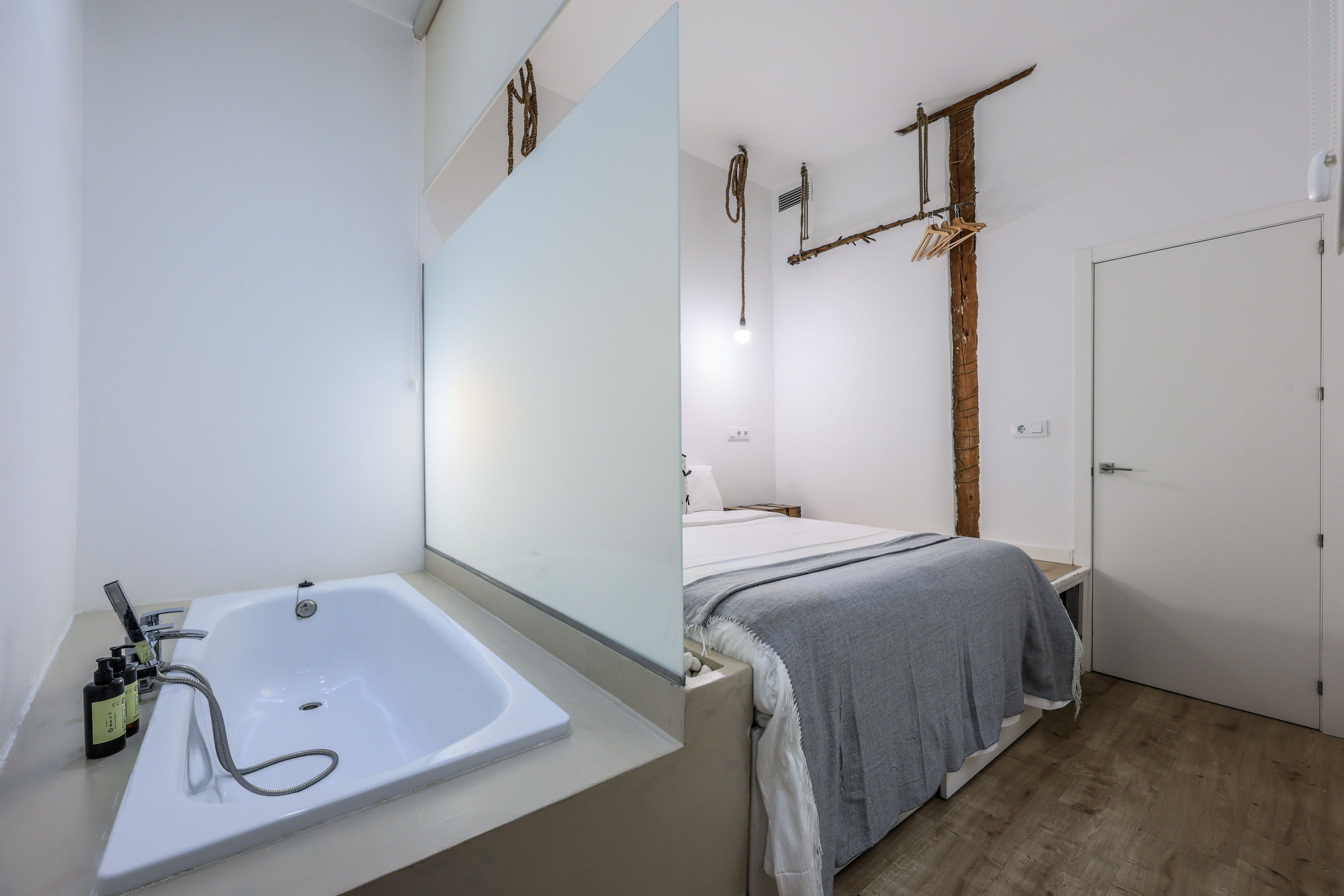 * A master bedroom with a double bed. It also has a bathtub next to the bed.