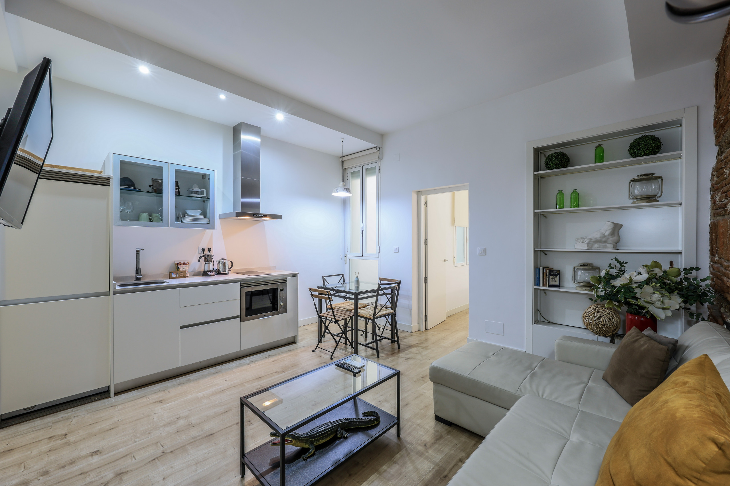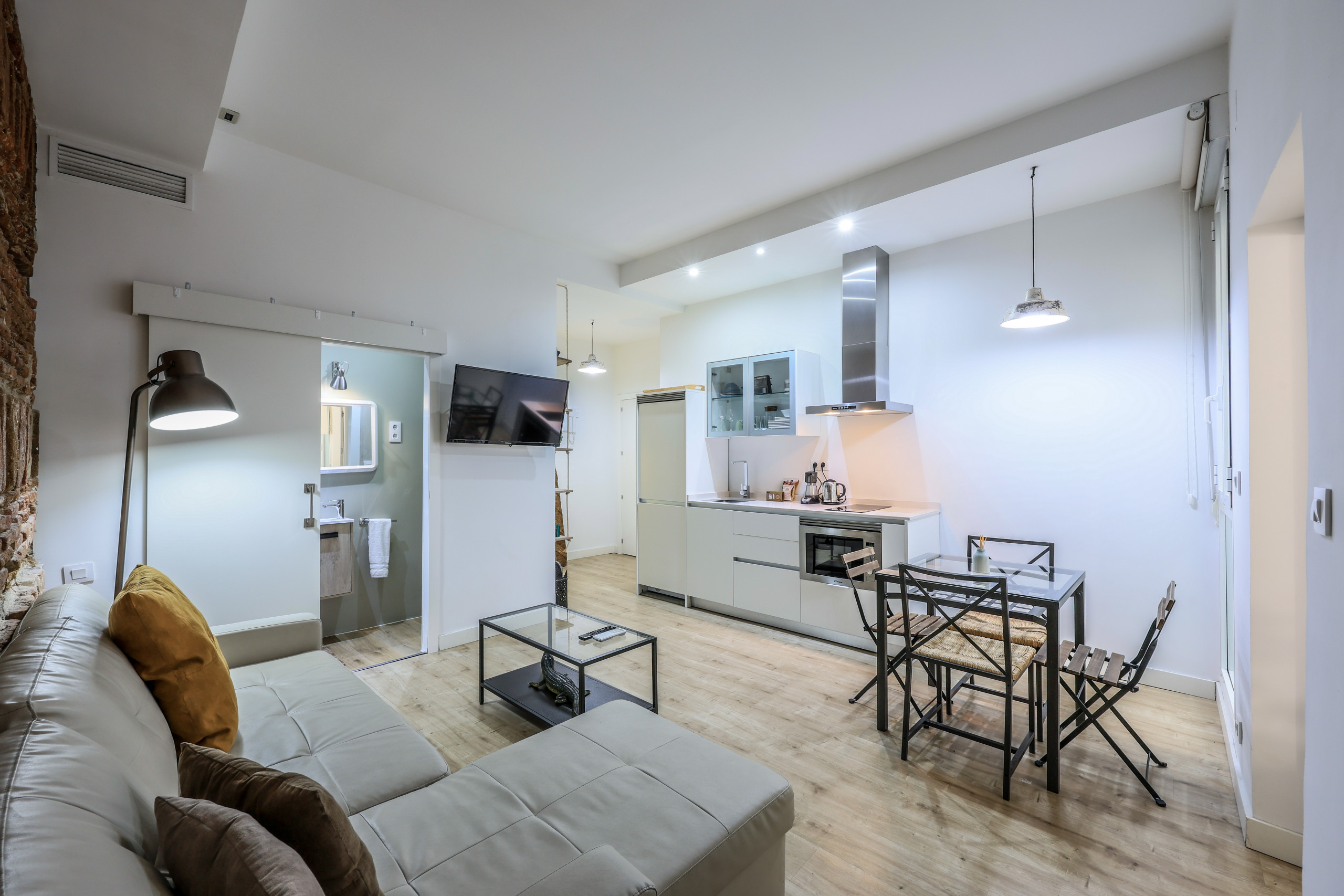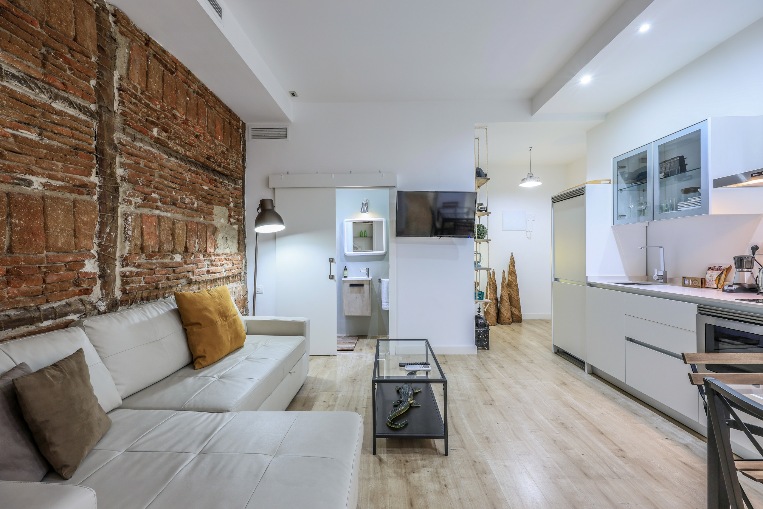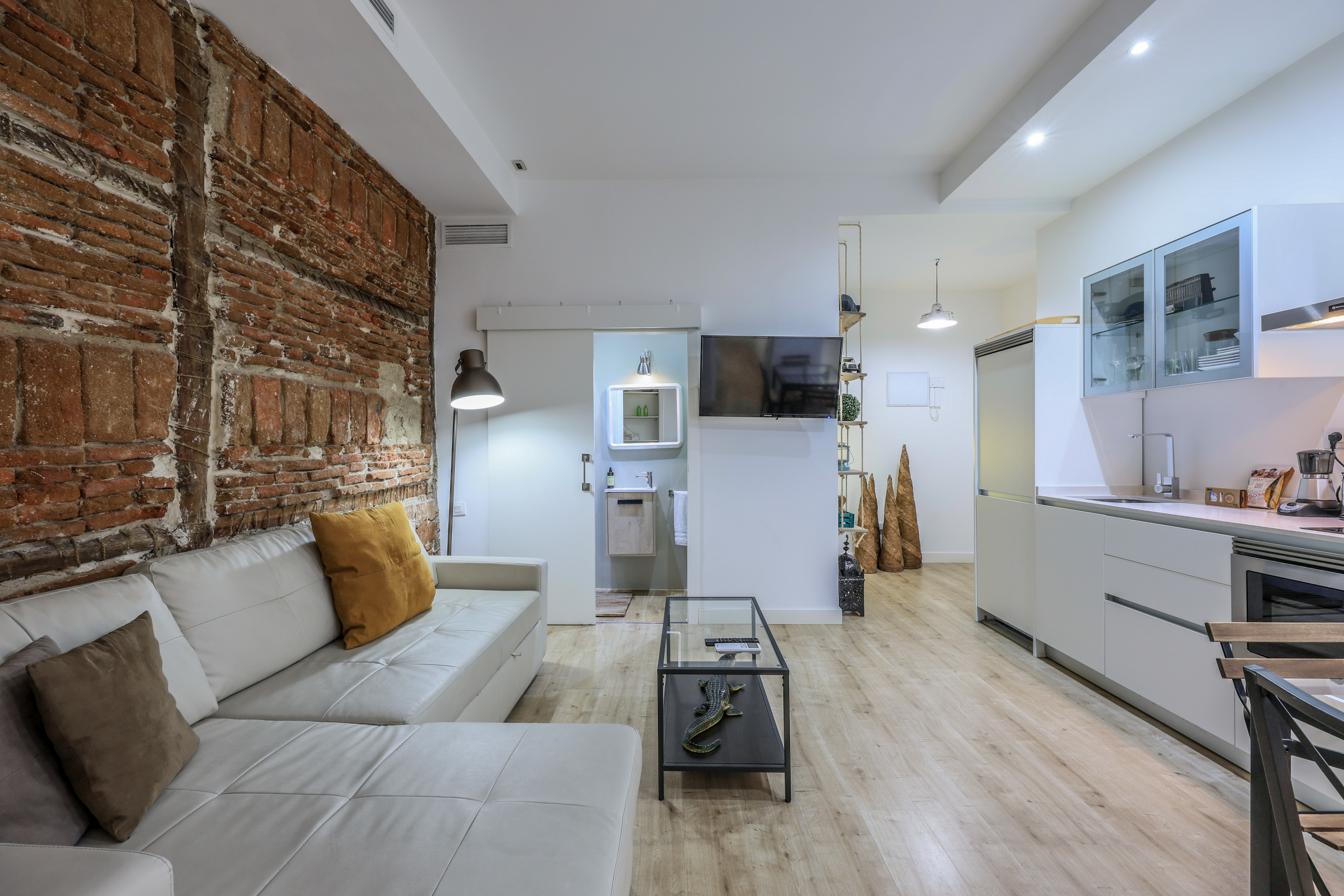 Discover design and comfort in Madrid's Chueca with this exclusive accommodation. Its enveloping atmosphere, flawless walls, and elegant wooden floors create a cozy space. Modern furniture blends with unique pieces, offering rest and relaxation. Soft lighting and quality textiles elevate your stay. A memorable experience awaits you in this corner of warmth and sophistication.