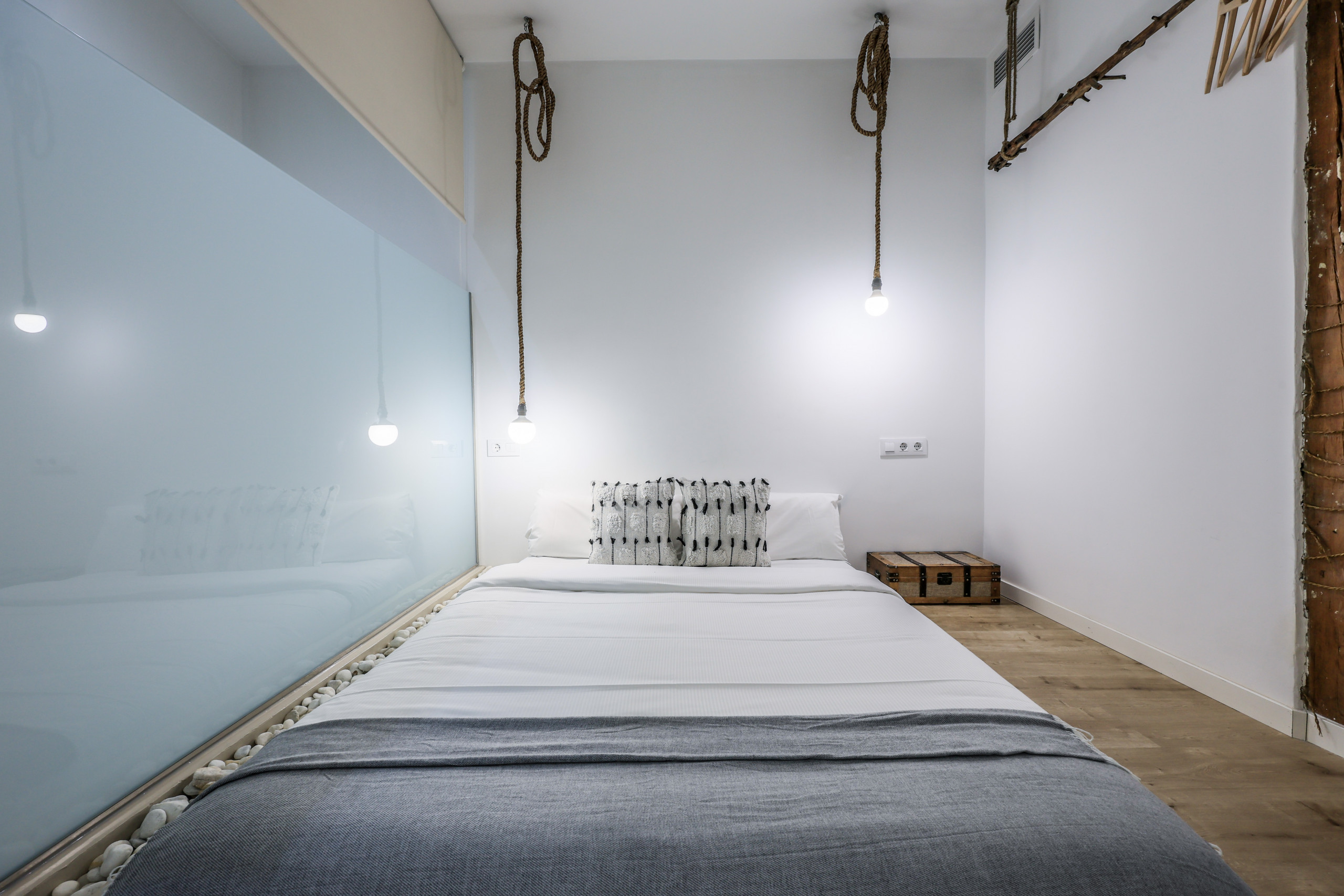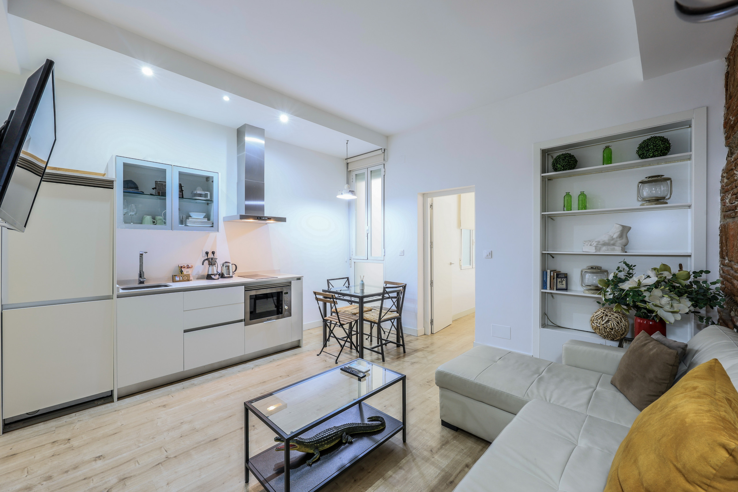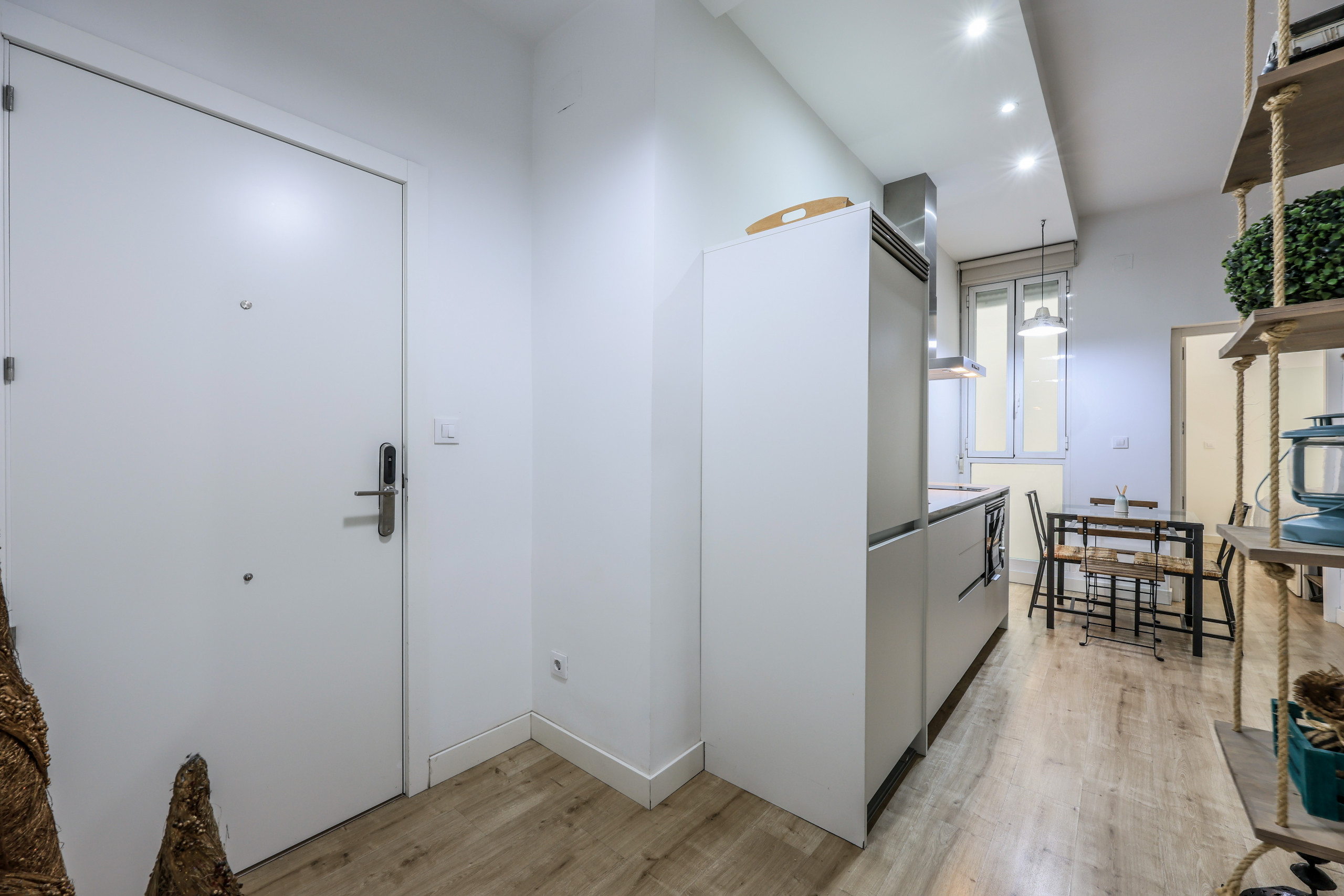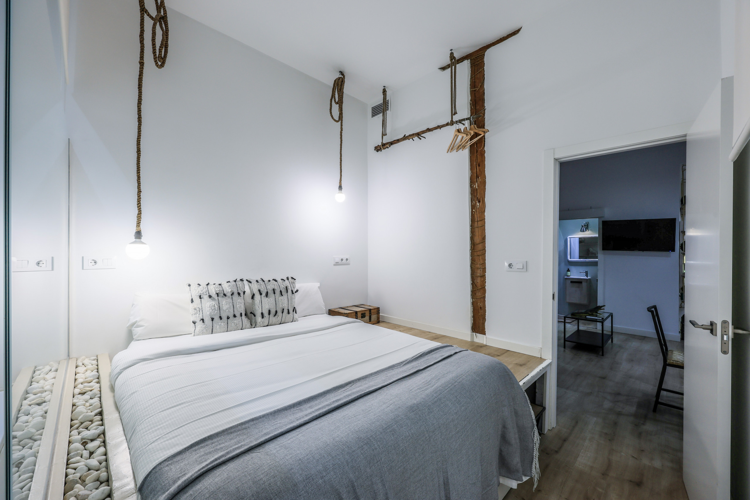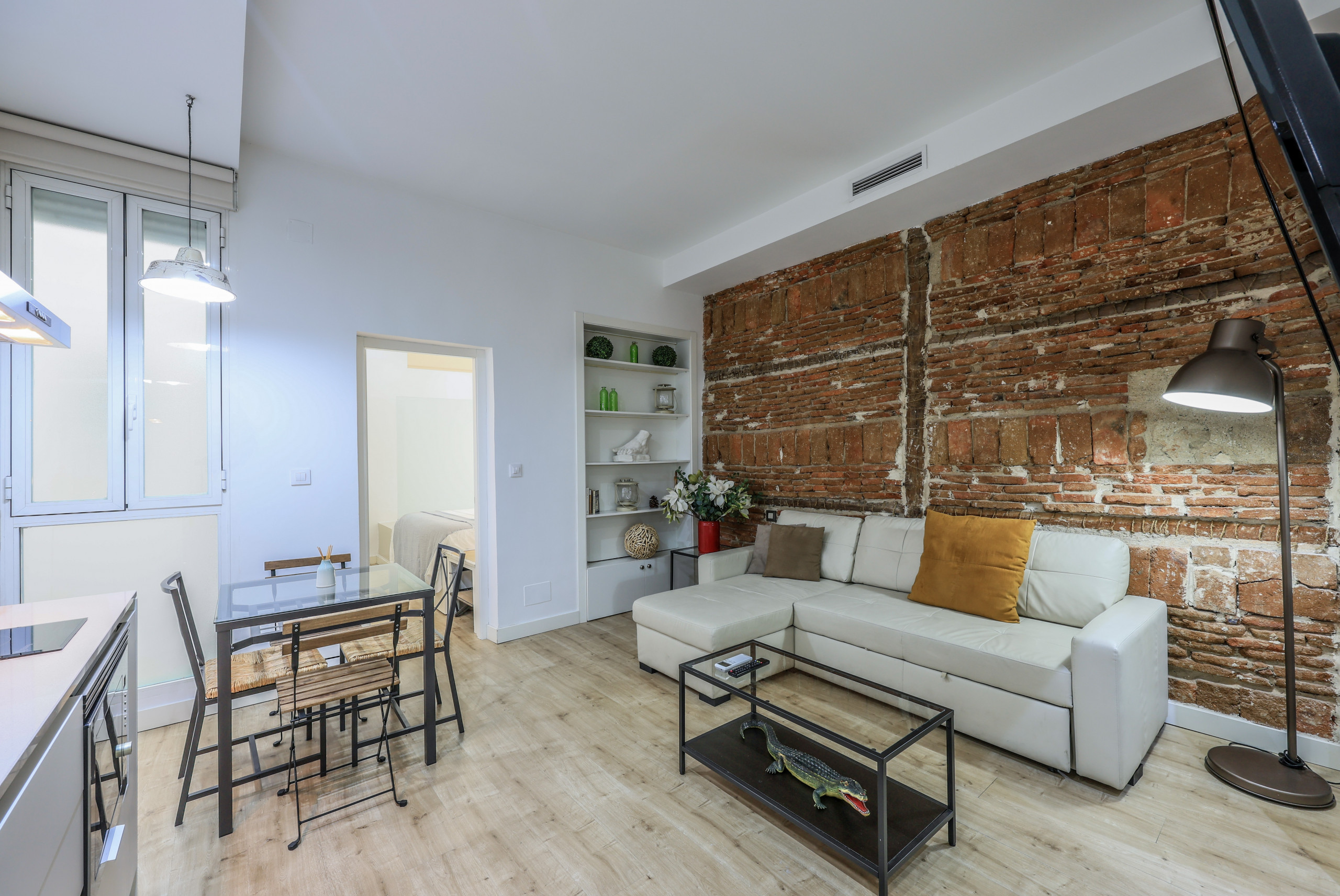 Discover design and comfort in Madrid's Chueca with this exclusive accommodation. Its enveloping atmosphere, flawless walls, and elegant wooden floors create a cozy space. Modern furniture blends with unique pieces, offering rest and relaxation. Soft lighting and quality textiles elevate your stay. A memorable experience awaits you in this corner of warmth and sophistication.