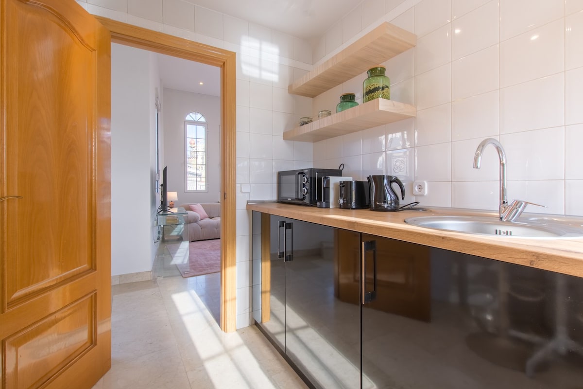 Kitchen: Renovated and equipped with everything you need so that you can enjoy great lunches and dinners in the apartment. It has a fridge, microwave, coffee maker, electric kettle, toaster and ceramic hob. It also has a space to eat or have breakfast, a high table with stools.