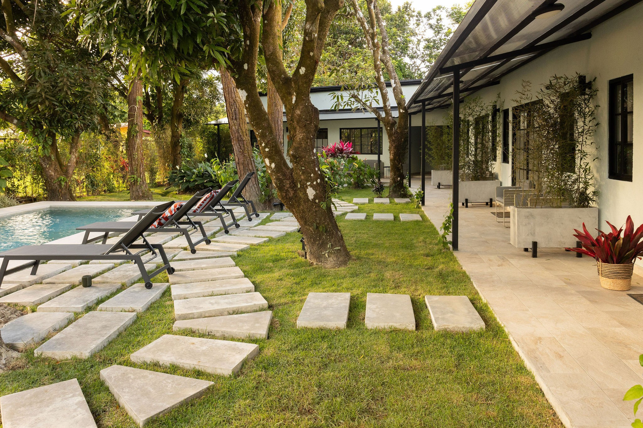 - Outdoor furniture with sun loungers.