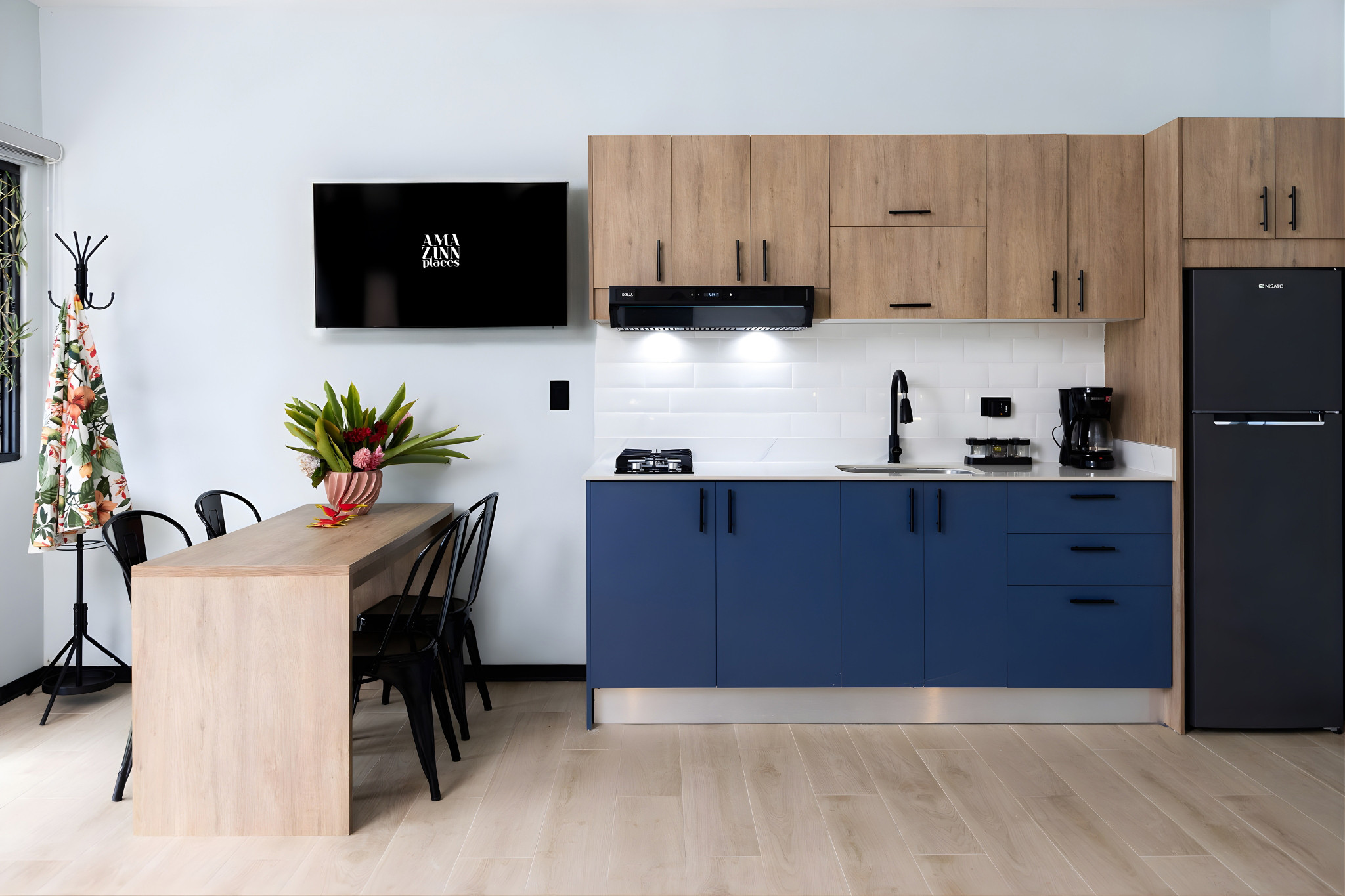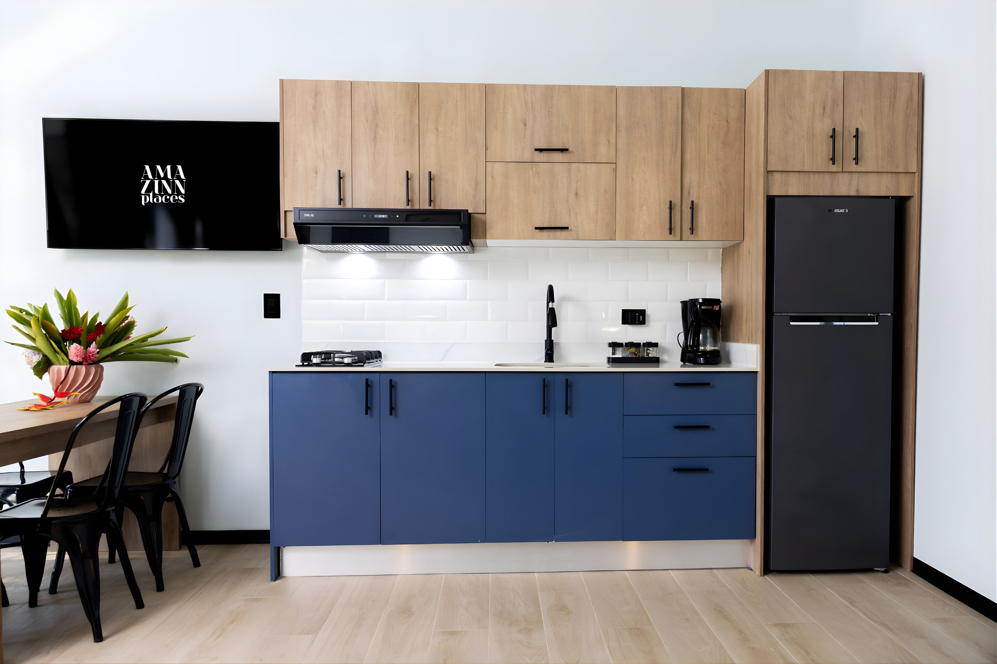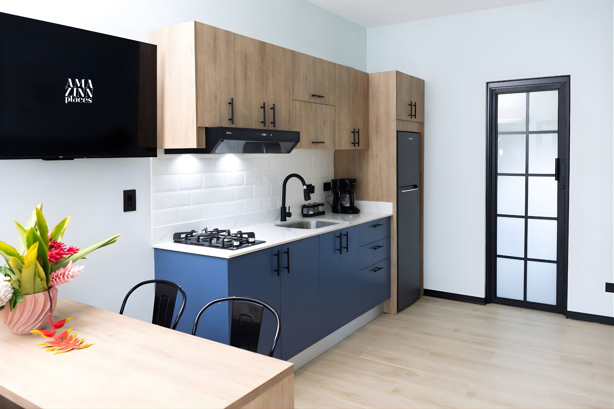 - Fully equipped American kitchen: gas stove with refrigerator and freezer, microwave, air fryer, coffee maker, water kettle, coffee, dishes, cutlery, wine glasses, basic utensils, dining table, and cleaning products.