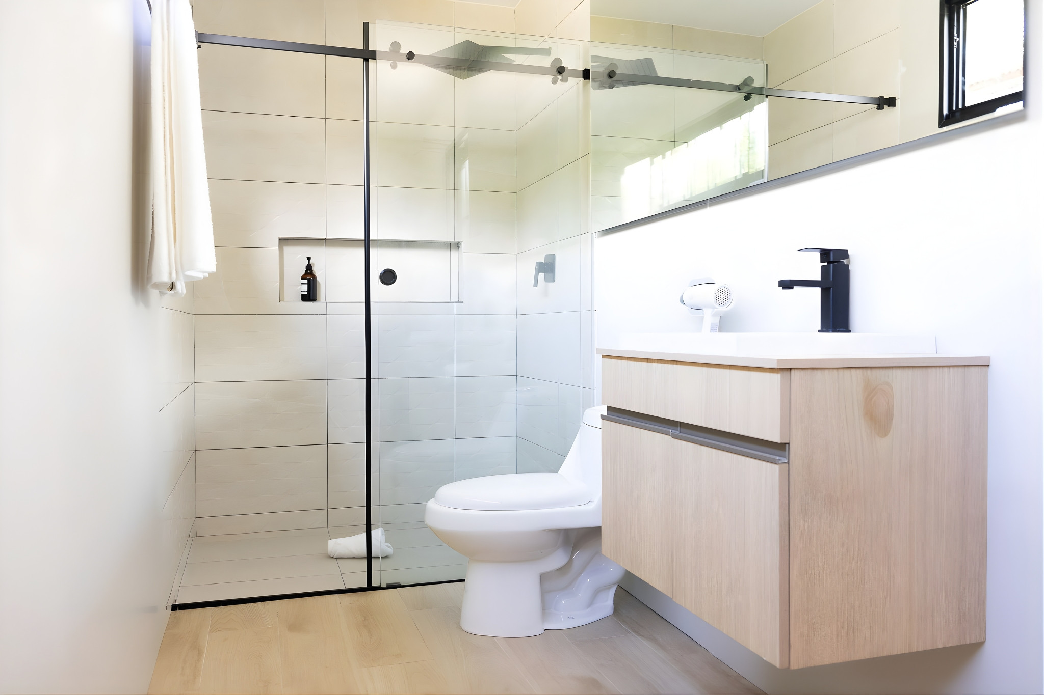 - 2 Bathrooms: 1 en-suite bathroom, 1 bathroom with access from the living room. Both include a shower with hot water, shampoo, shower gel, hairdryer, towels included, and a window for natural ventilation.