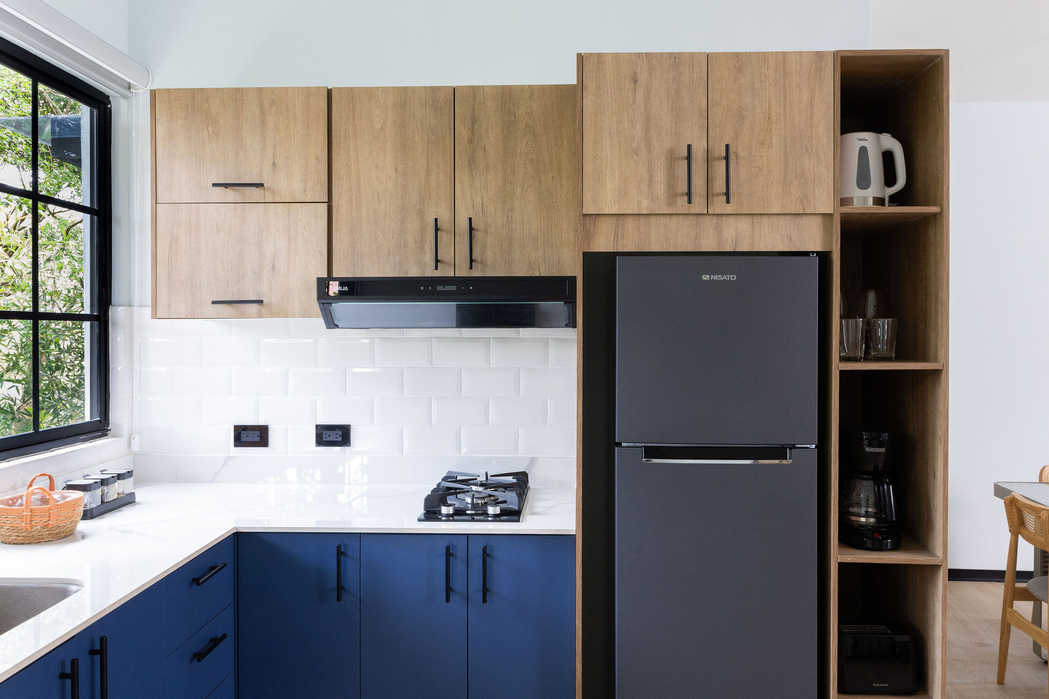 - Fully equipped American kitchen: gas stove with refrigerator and freezer, microwave, air fryer, coffee maker, water kettle, coffee, dishes, cutlery, wine glasses, basic utensils, dining table, and cleaning products.