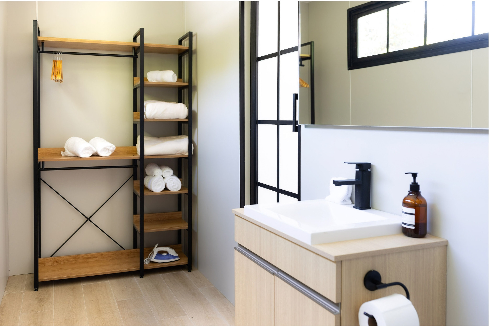 - Bedroom Area: Equipped with 2 Queen Beds, Air Conditioning, Additional Pillows and Blankets, Wardrobe, Coffee Maker, Coffee, Heating (Heat Pump), Smoke Detector, Carbon Monoxide Detector, Desk and Chair, Clothing Storage Space, Kettle, Hangers, Blinds, Iron, Bedding, Window Locks, Clothes Drying Rack, TV, Ceiling Fan.