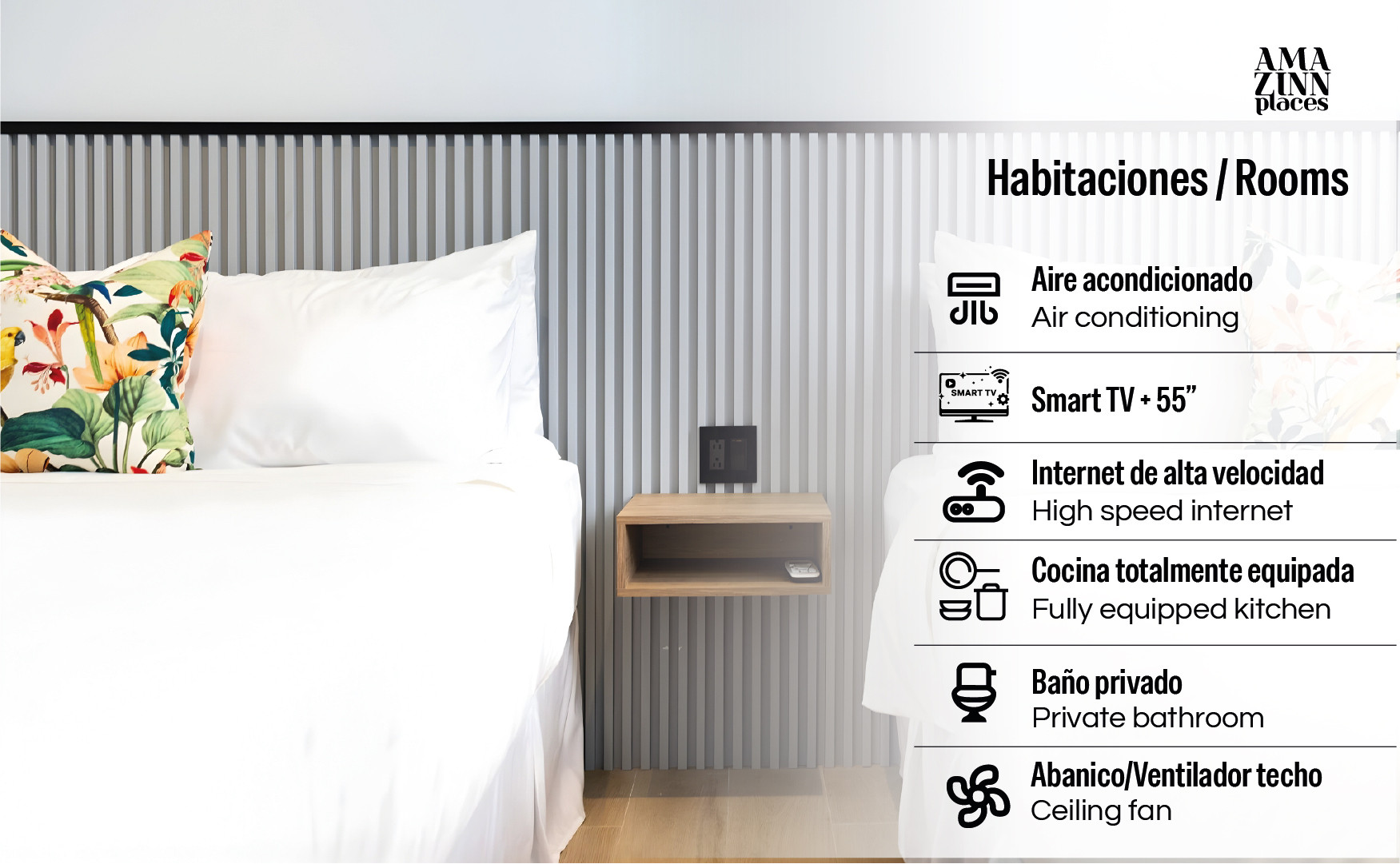 - Bedroom: Spacious and comfortable studio with 2 Queen beds, bedding included, air conditioning, ceiling fan and blackout blinds or curtains for optimal rest. Features a desk with chair, work area with good lighting, Smart TV and high-speed wifi. Includes wardrobe or clothing storage space with hangers, iron, additional pillows and blankets. Has smoke and carbon monoxide detectors, as well as window locks.