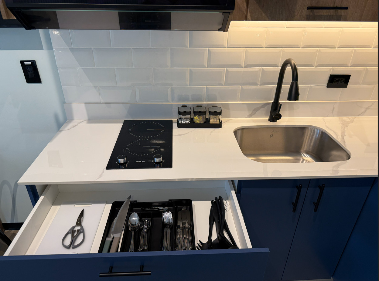 - Bedroom Area: Equipped with 2 Queen Beds, Air Conditioning, Additional Pillows and Blankets, Wardrobe, Coffee Maker, Coffee, Heating (Heat Pump), Smoke Detector, Carbon Monoxide Detector, Desk and Chair, Clothing Storage Space, Kettle, Hangers, Blinds, Iron, Bedding, Window Locks, Clothes Drying Rack, TV, Ceiling Fan.